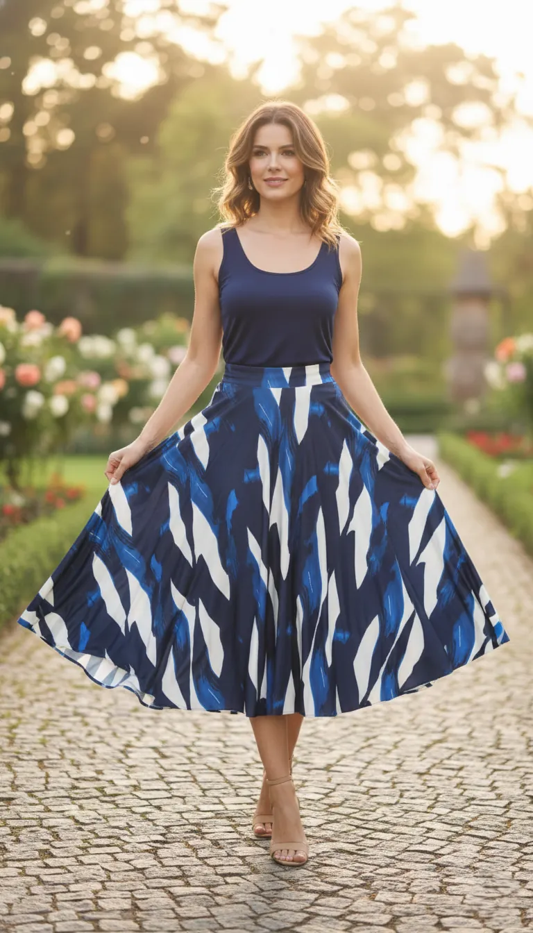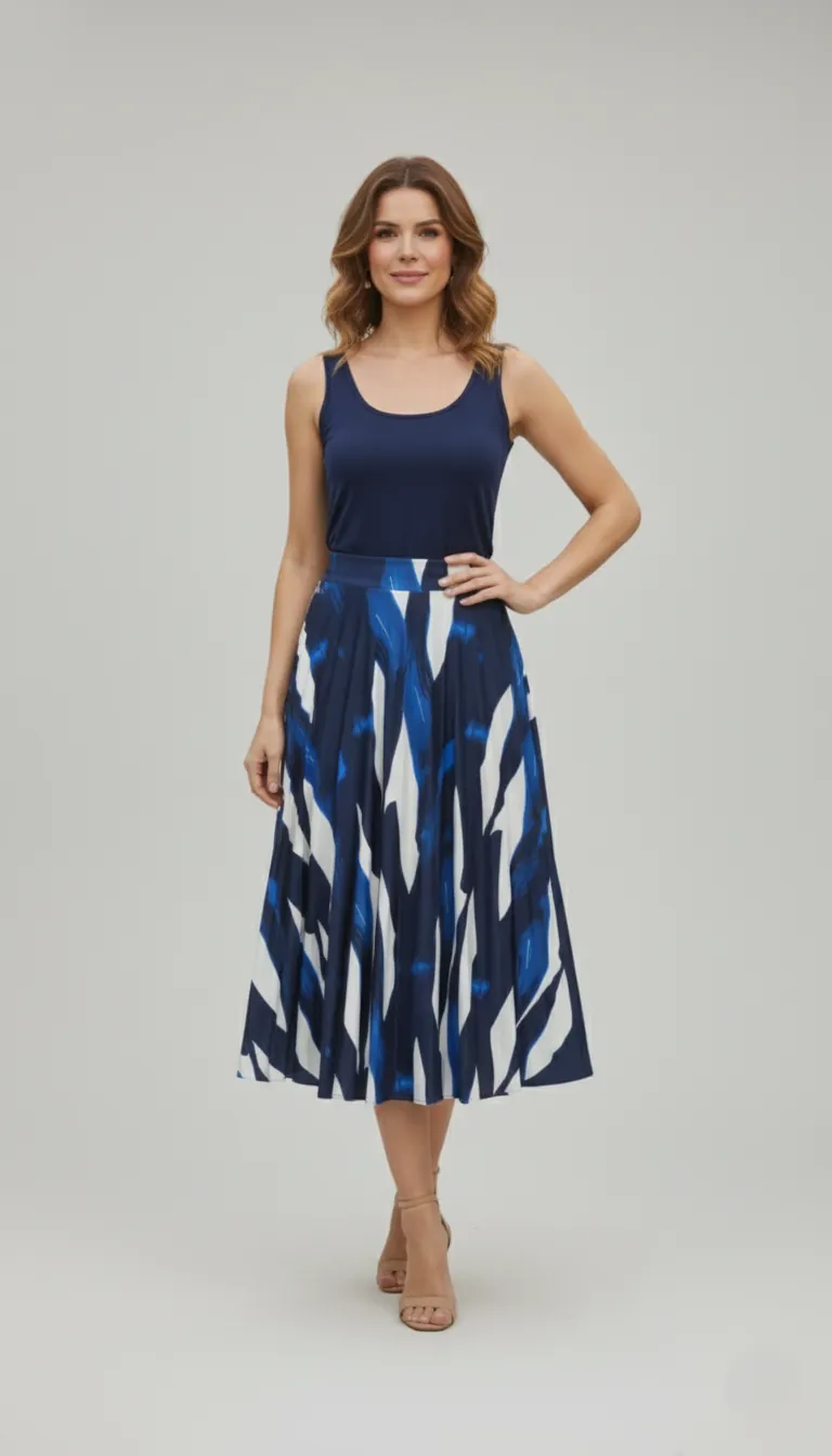 • Viagens e Eventos: Sua leveza e estampa a tornam ideal para viagens, encontros e looks de elegância casual. Sugira combinações com regatas finas (como a azul-marinho vista no manequim), sandálias de salto bloco ou tênis minimalistas.