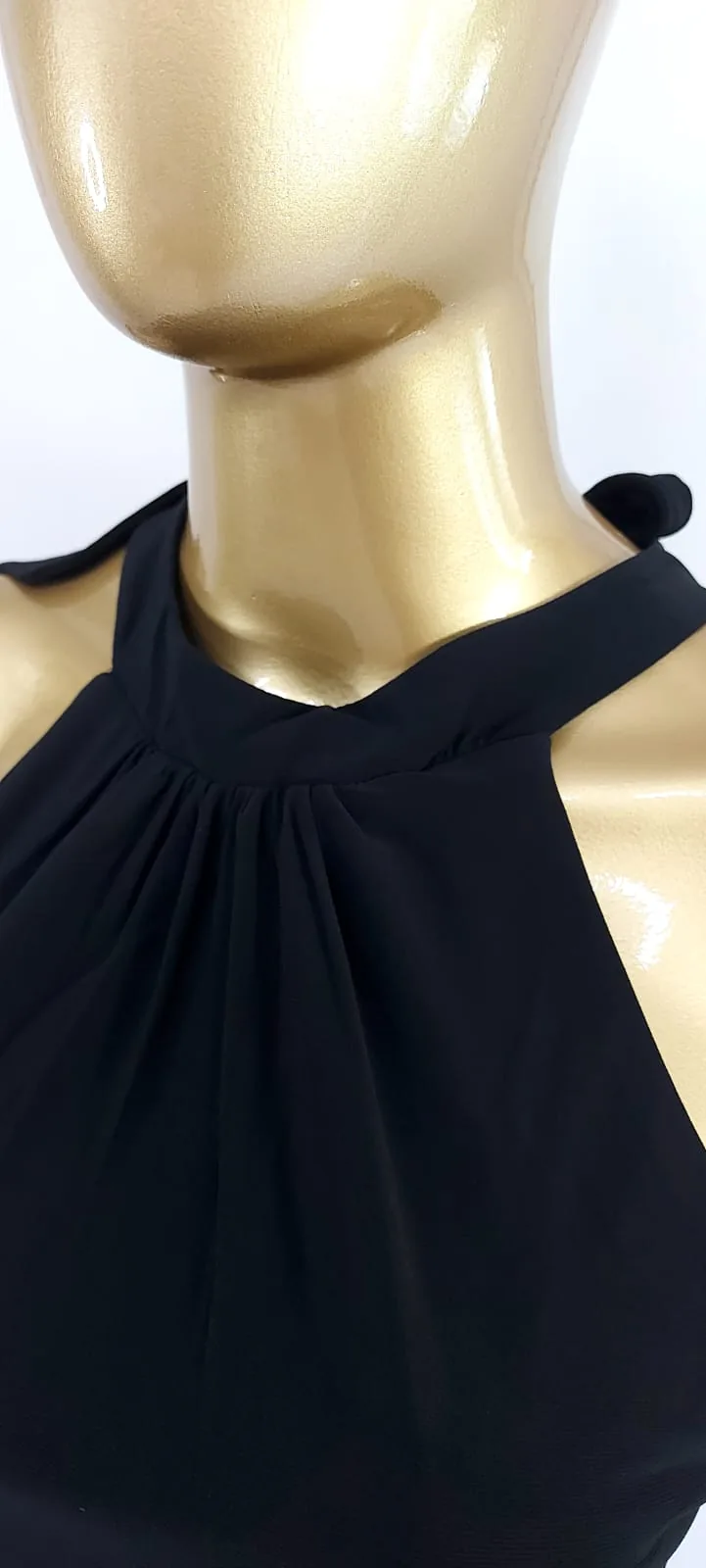 O design sofisticado apresenta gola alta franzida que cria um visual delicado e elegante, enquanto a amarração na parte de trás do pescoço permite ajuste personalizado e acrescenta um detalhe refinado ao look. O modelo halter valoriza os ombros e alonga a silhueta, tornando esta blusa perfeita para compor produções casuais ou sociais.