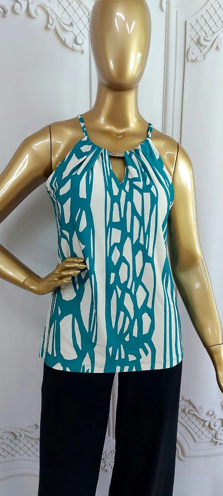 O design é marcado pela estampa exclusiva de inspiração geométrica. O padrão vibrante e moderno combina o frescor do Verde Esmeralda com a luminosidade do Off-White, criando um contraste visual harmonioso e sofisticado. O modelo é um elegante halter (frente única) com alças finas que se encontram no pescoço, e uma gola levemente franzida que adiciona textura e suavidade ao decote.