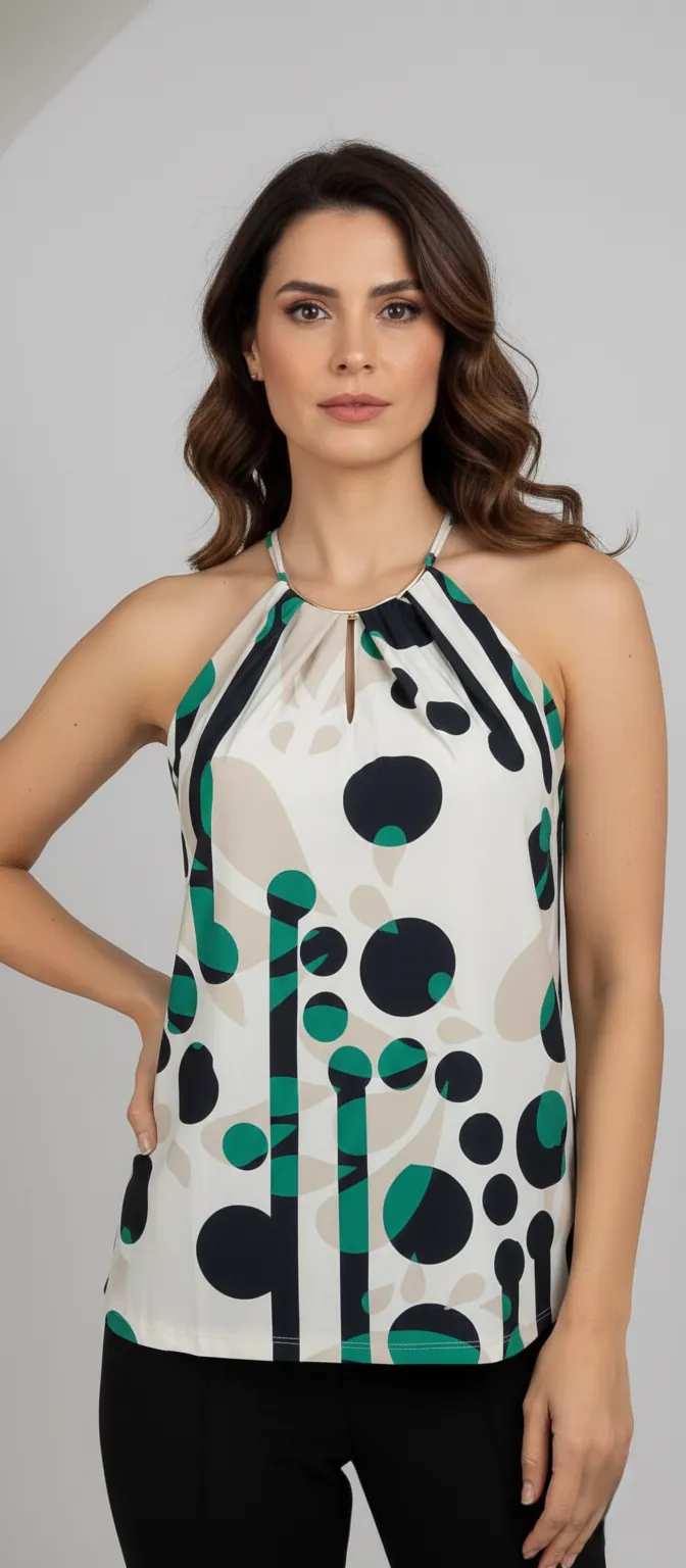O decote halter (frente única) é sutilmente adornado com um detalhe em maxicolar dourado de alta qualidade que adiciona um toque de luxo discreto e modernidade ao visual. A escolha ideal para looks casuais e elegantes em viagens ou momentos de lazer. Seu caimento fluido e toque macio garantem que você se sinta elegante e poderosa ao mesmo tempo, seja no trabalho ou em eventos especiais. Uma peça versátil e indispensável para elevar qualquer produção.
