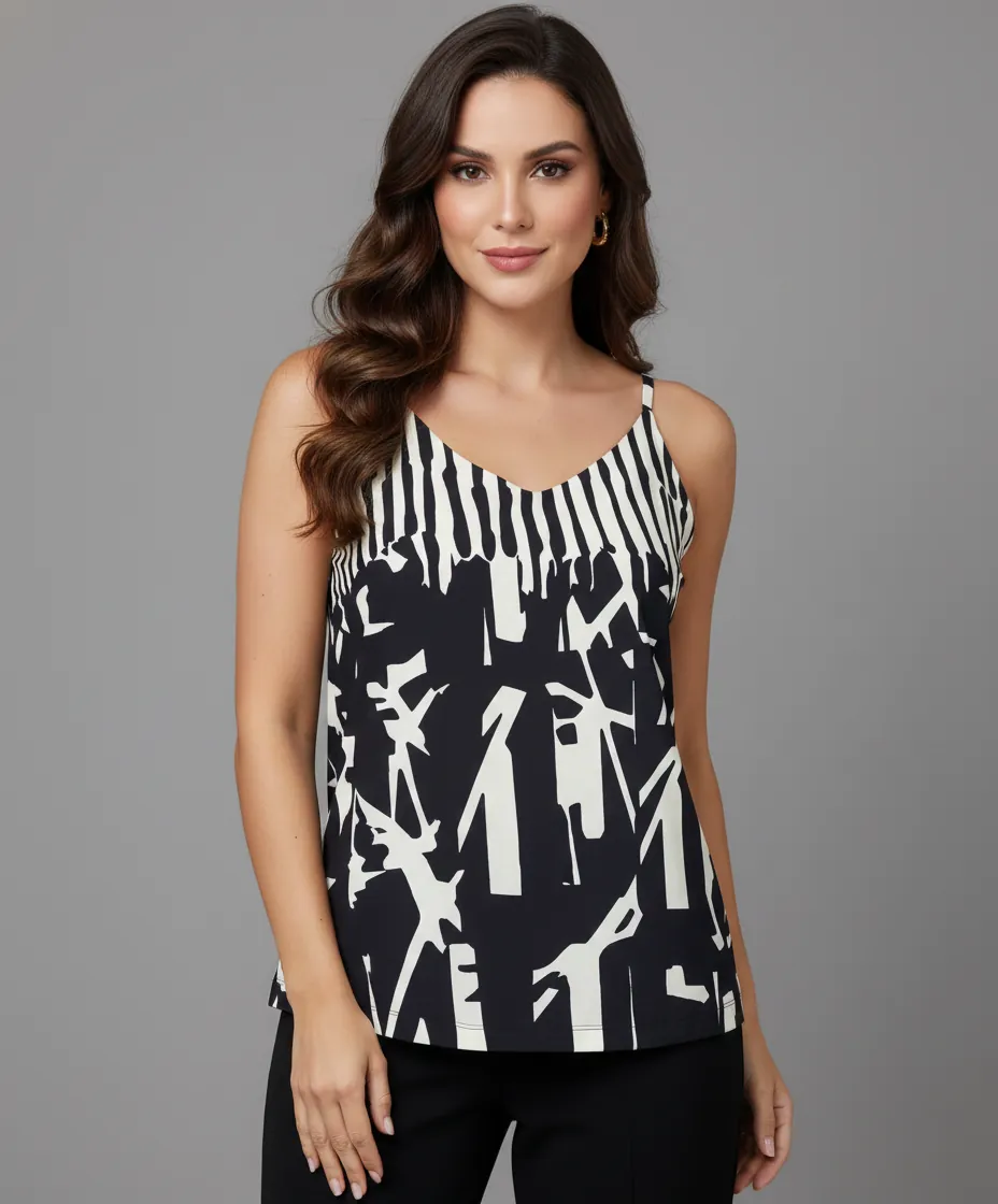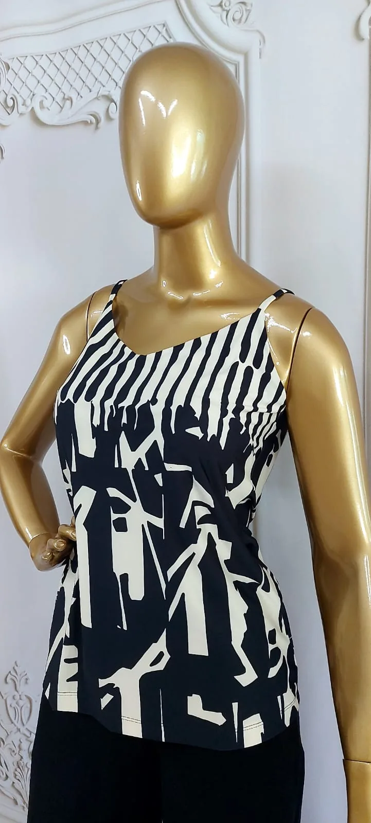A blusa apresenta um design sofisticado com alças finas e decote delicado, proporcionando um visual feminino e elegante. Sua estampa exclusiva abstrata, em preto e off-white, cria um contraste marcante e contemporâneo, ideal para compor looks minimalistas, urbanos e versáteis.