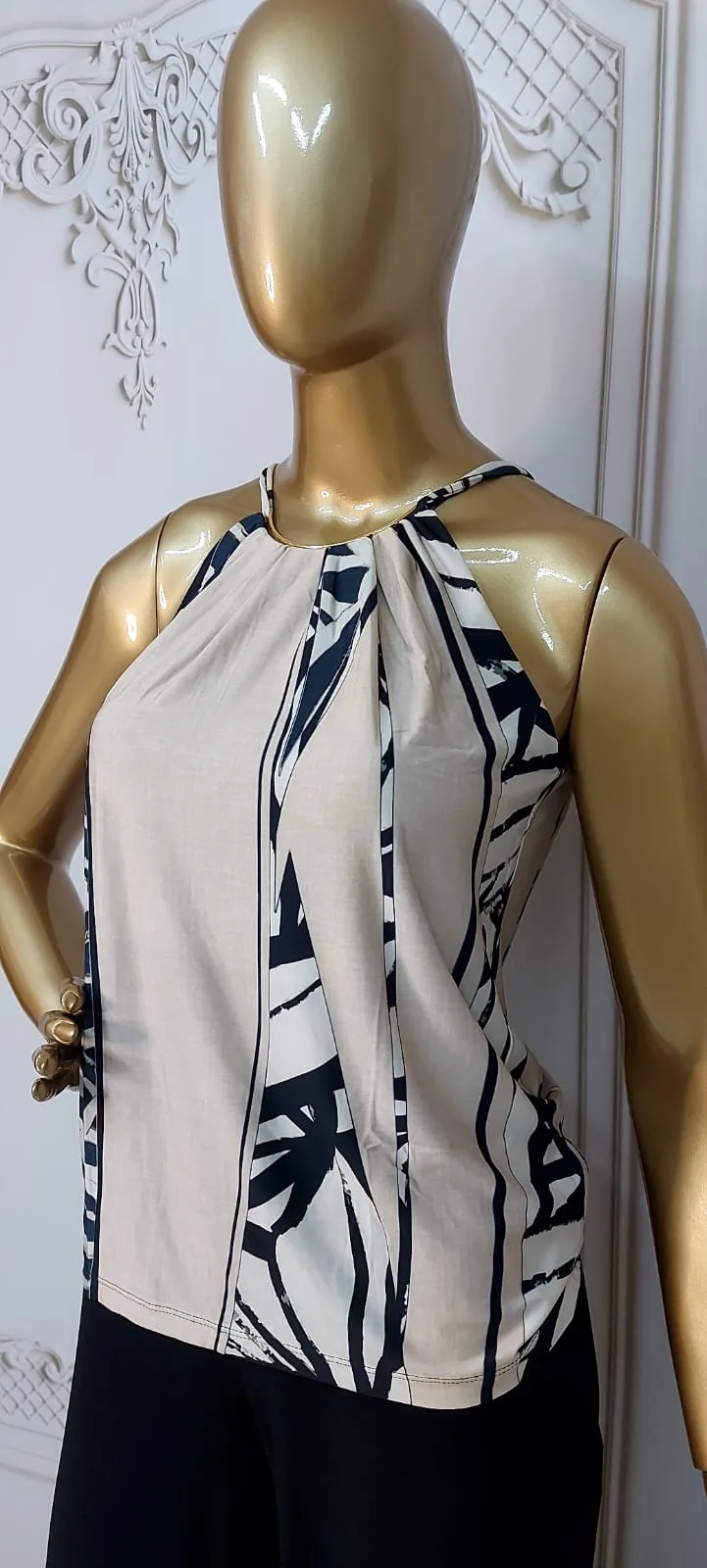 O design da blusa é o elegante modelo Halter com alças finas que se encontram no pescoço. A gola levemente franzida adiciona um charme delicado e volume sutil ao busto.