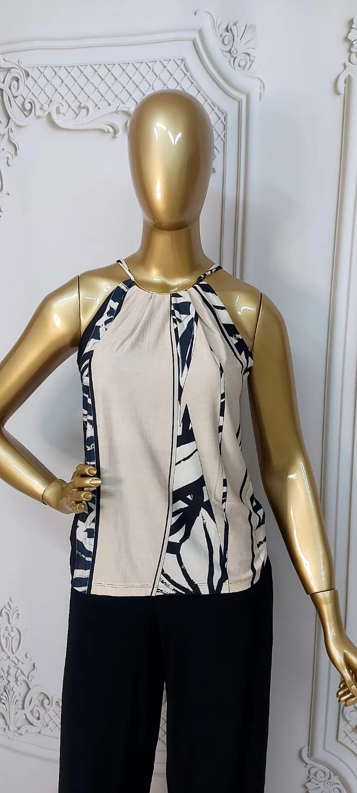O decote é valorizado pelo adereço metálico dourado. Este detalhe de alta qualidade adiciona um toque de brilho e elegância, atuando como um colar embutido que eleva o visual e posiciona esta blusa como um item de roupas premium com acabamento refinado e estilo moderno.