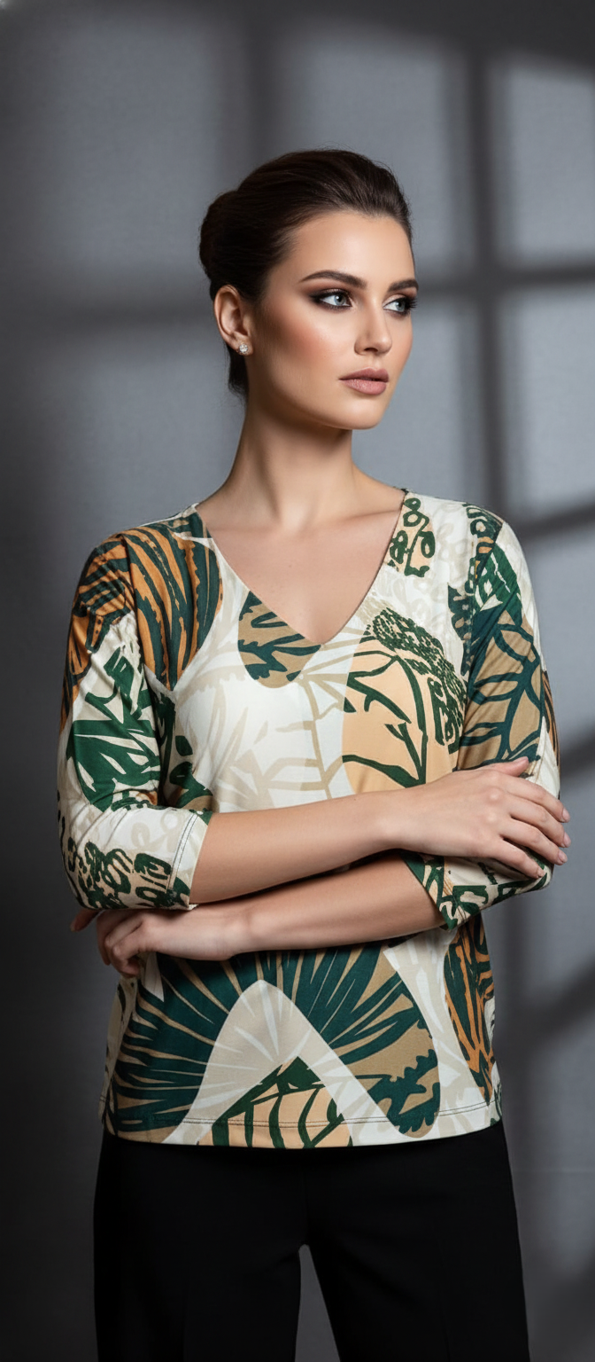 Blusa Luna Bella Manga 3/4 Malha Fluity Premium – Estampa Tropical Geo
