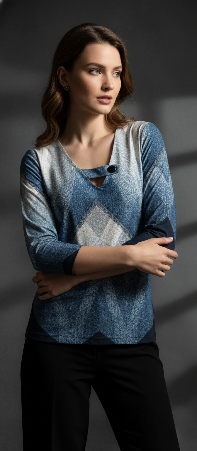 Renove seu guarda-roupa com esta blusa feminina de manga 3/4, desenvolvida na malha fluity premium em tecido leve, confortável e com excelente caimento. Ideal para quem busca estilo moderno, visual elegante e versatilidade no dia a dia. Sua estampa geométrica exclusiva mistura tons de azul jeans, azul marinho, cinza claro, cinza médio e off-white, criando um design sofisticado e contemporâneo.