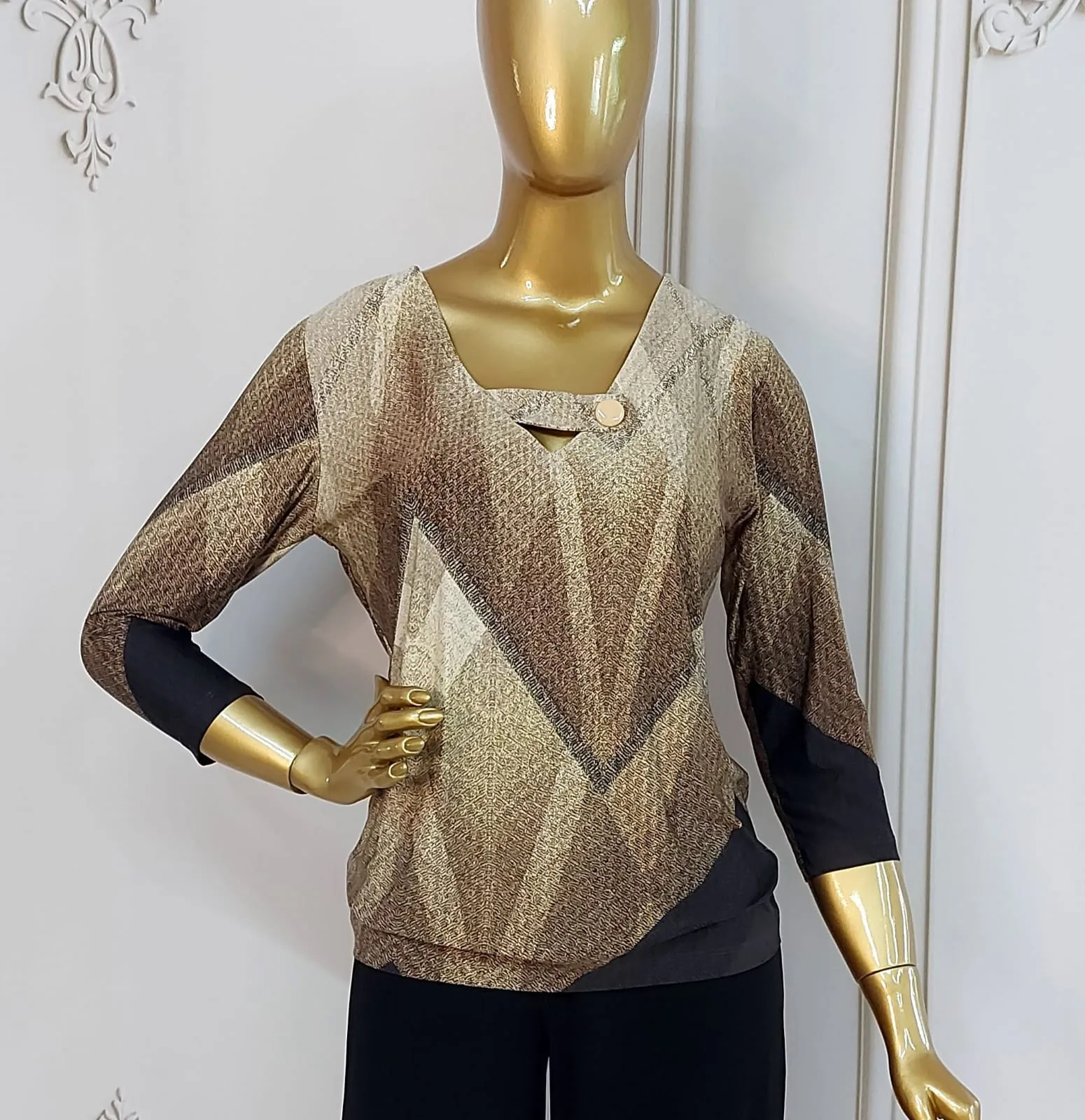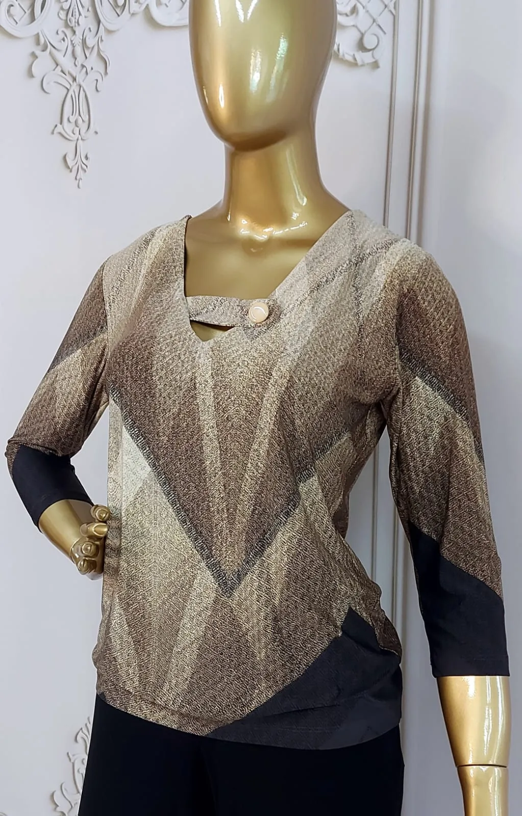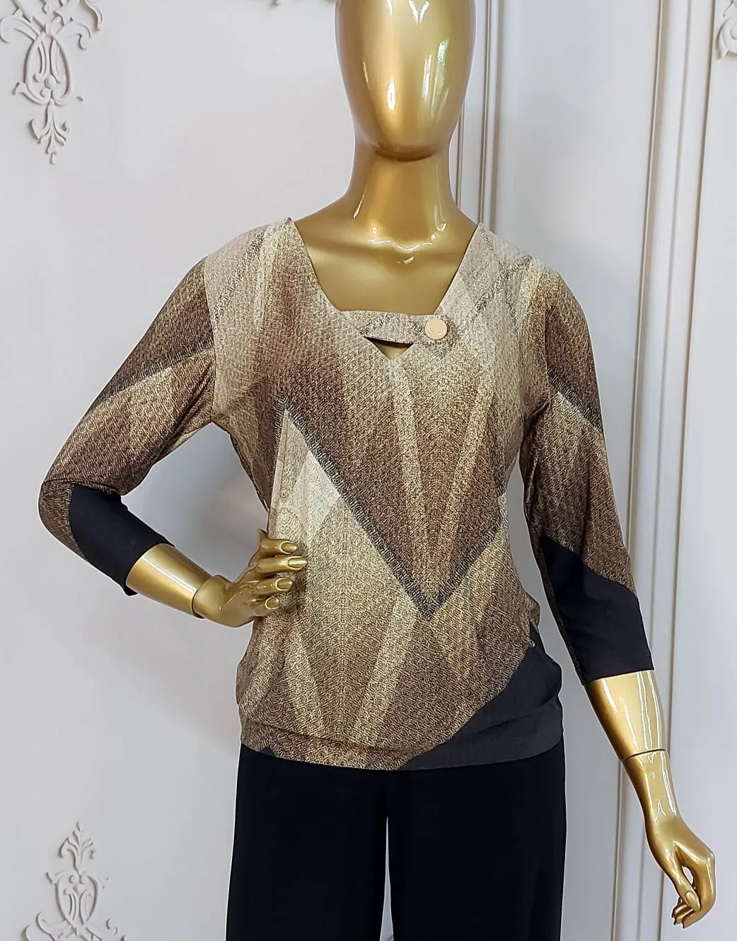A peça traz uma estampa geométrica exclusiva em uma paleta sofisticada de tons terrosos, combinando bege, areia, caramelo, marrom claro, marrom escuro e preto. Os desenhos triangulares e diagonais criam um efeito visual moderno e elegante, alongando a silhueta e agregando personalidade ao look.