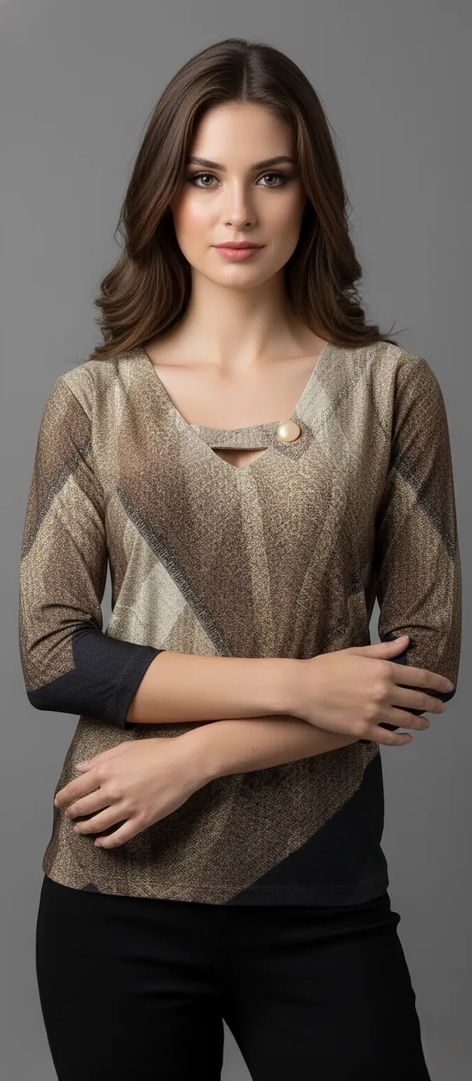 As mangas 3/4 oferecem versatilidade, tornando a blusa ideal para todas as estações. A modelagem levemente acinturada valoriza o corpo sem marcar, proporcionando um ajuste elegante e confortável.