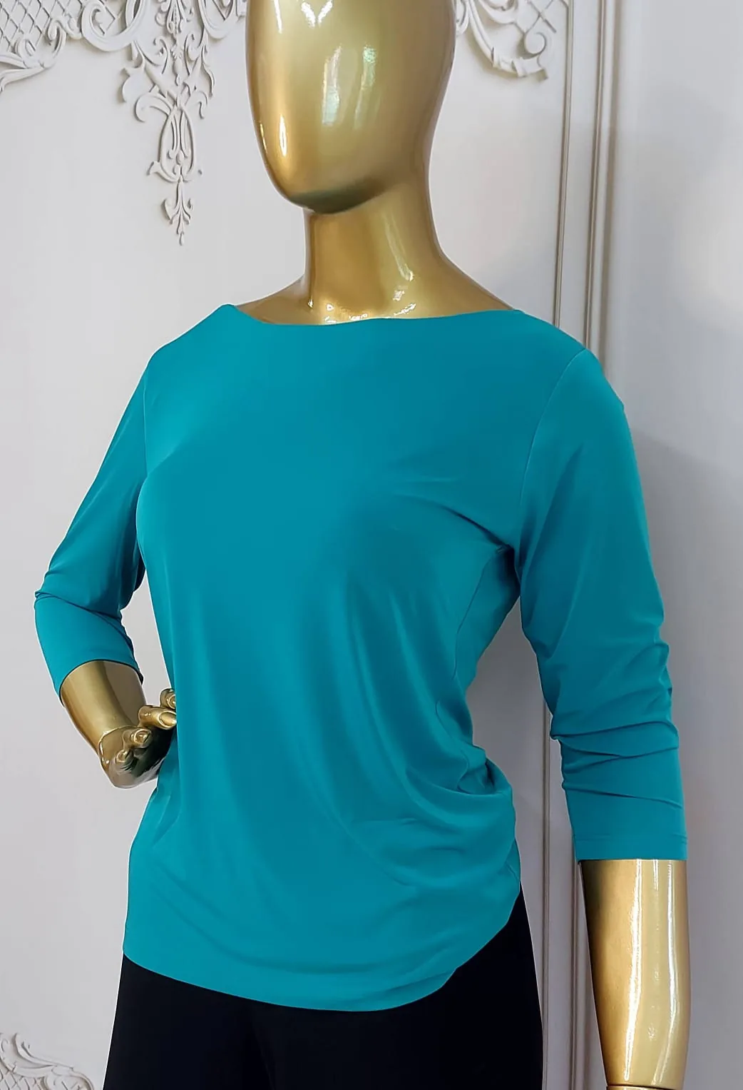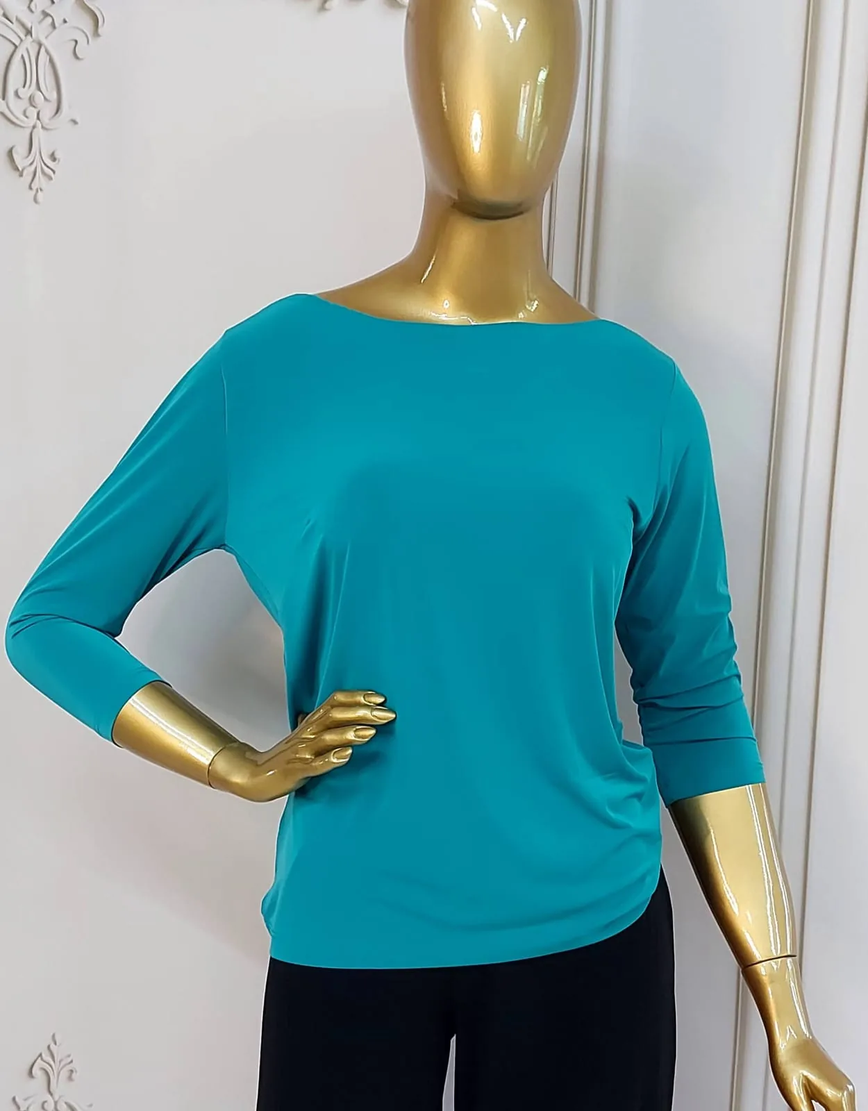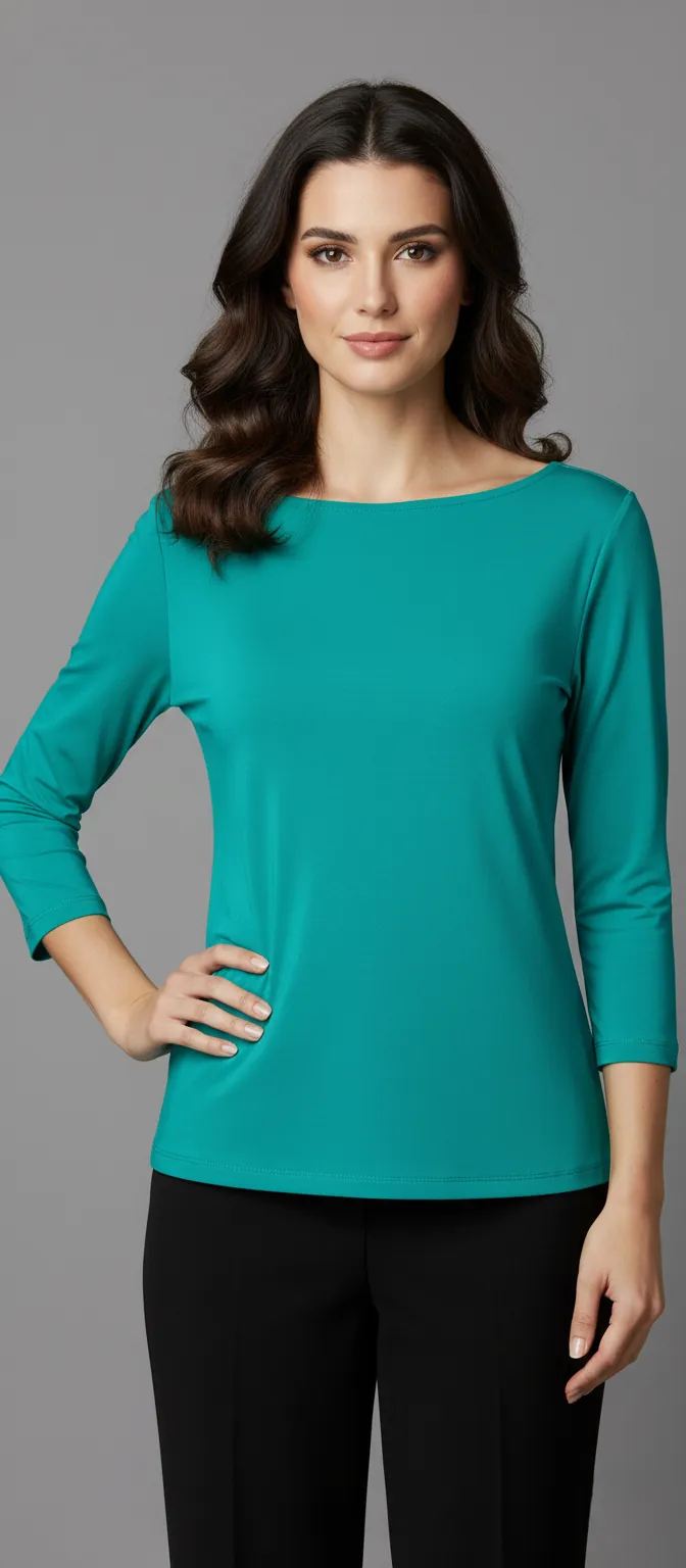 A blusa possui mangas 3/4, ideais para todas as estações, e um decote canoa clássico, que valoriza a região dos ombros com delicadeza. Seu caimento leve oferece movimento natural ao vestir, mantendo o corpo elegante sem marcar.