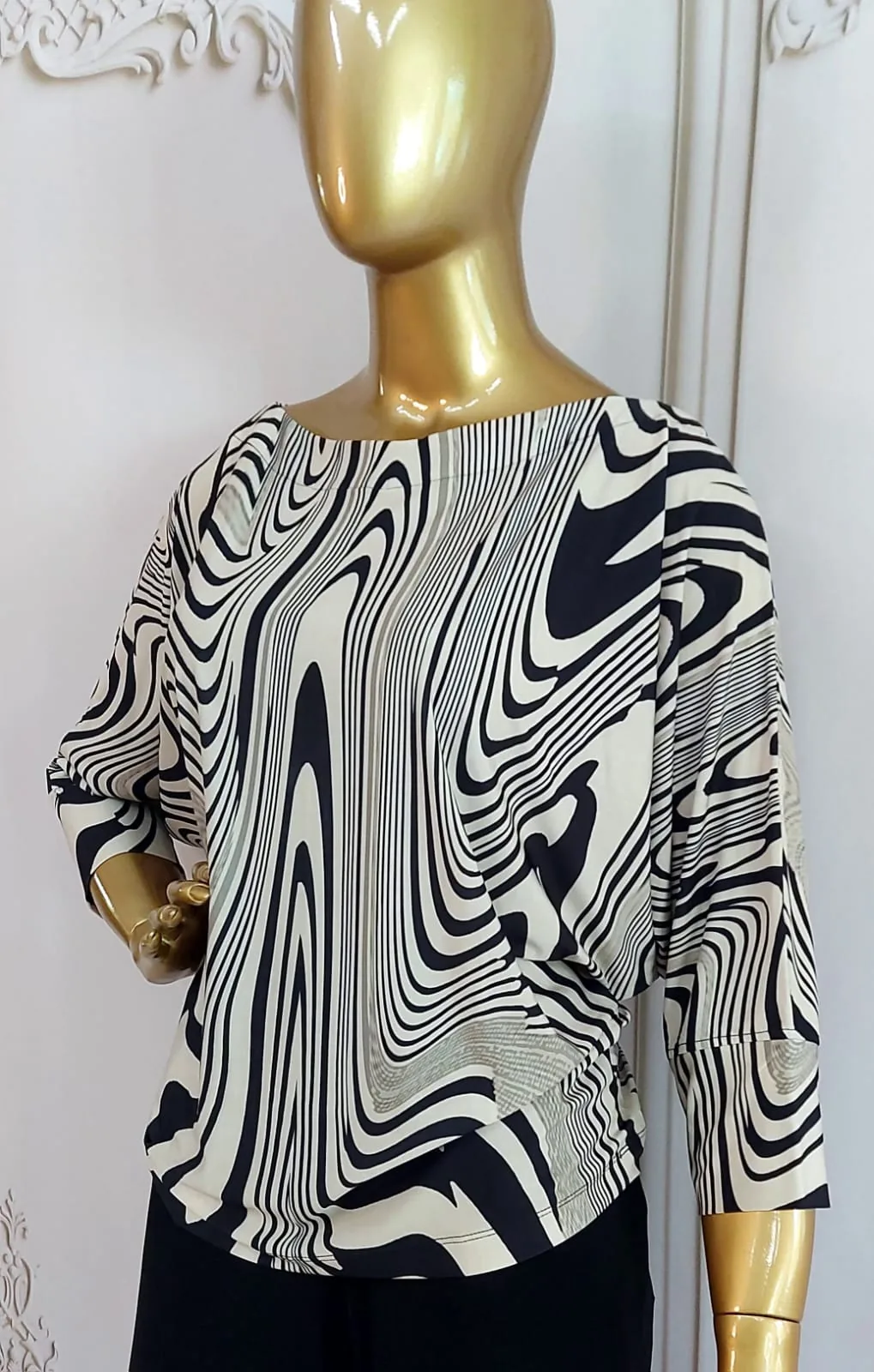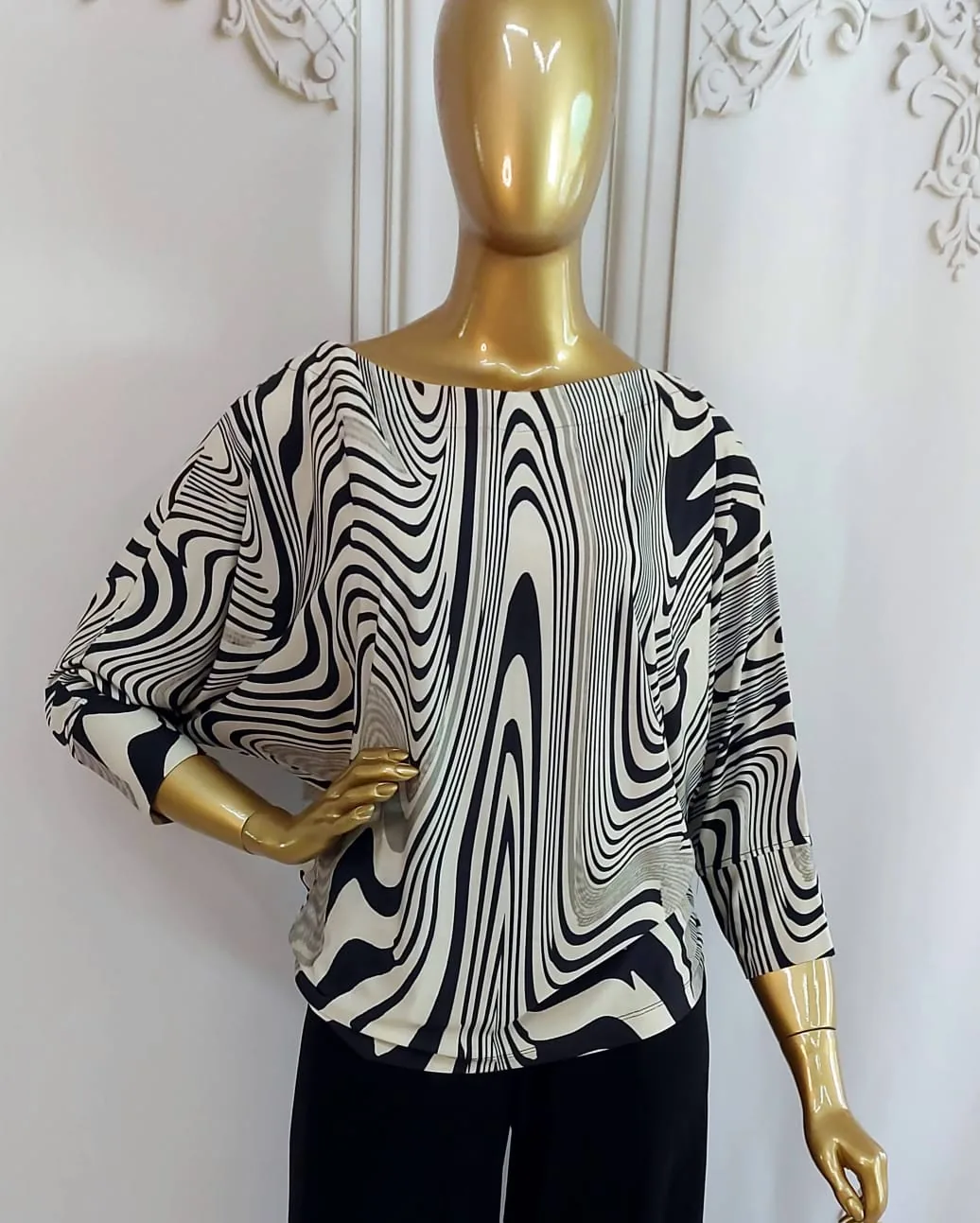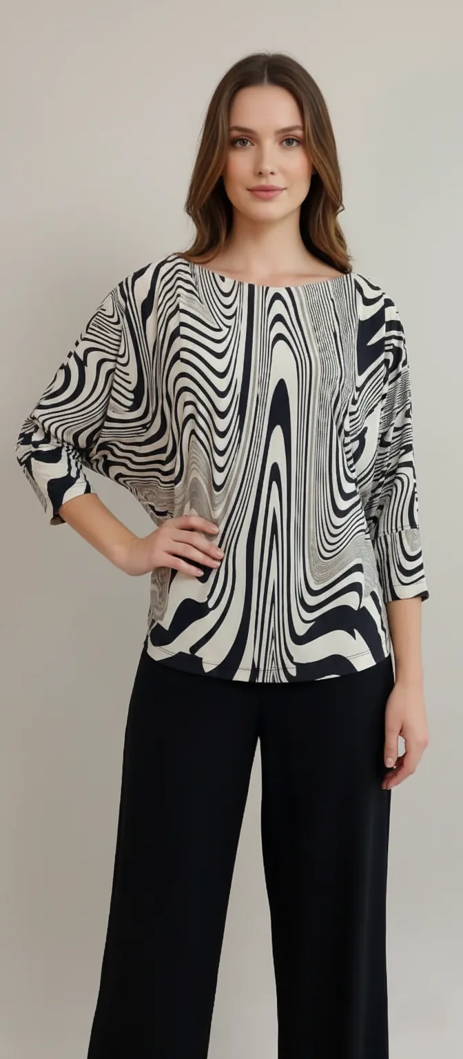 O modelo é um moderno manga morcego, que confere um volume elegante e descontraído na parte superior, transitando para mangas 3/4. O decote canoa valoriza os ombros de forma discreta e sofisticada.