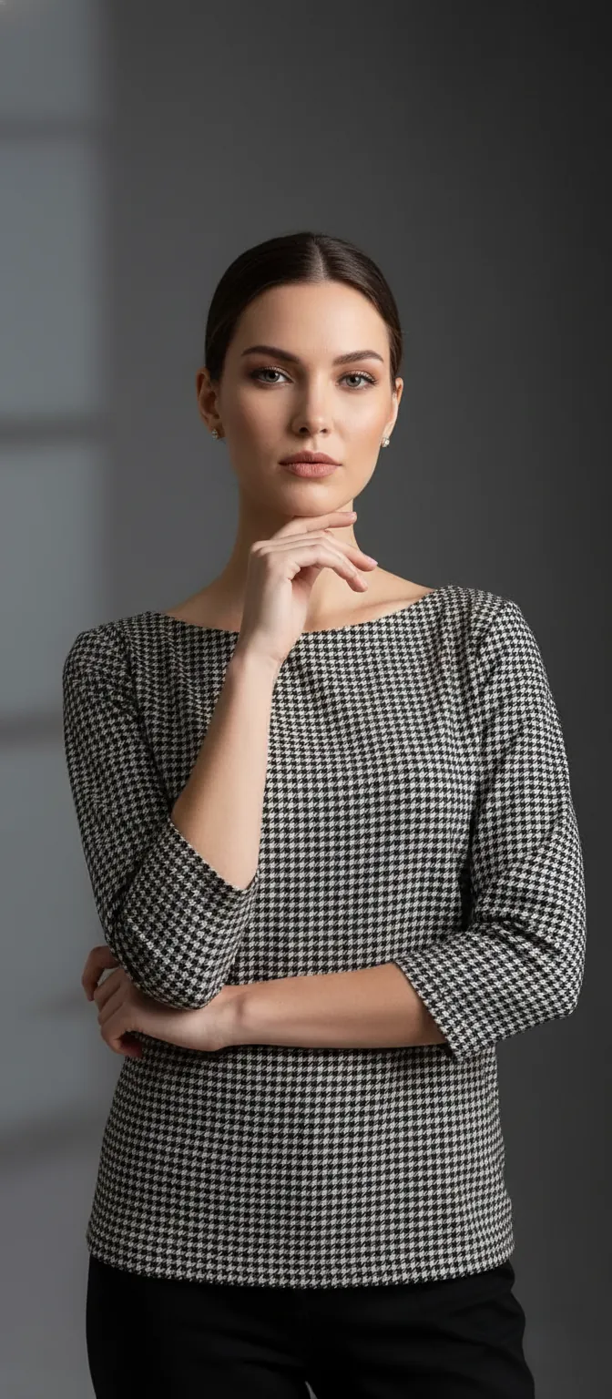 Blusa Anahi Feminina Premium, uma peça que traz a sofisticação atemporal do Pied de Poule combinada com o conforto da tecnologia moderna. Confeccionada na aclamada Malha Fluity Premium, esta blusa entrega um toque suave e macio e um caimento leve inigualável. O tecido é de alta qualidade e é conhecido por sua excelente elasticidade e respirabilidade, garantindo um look confortável que se adapta ao corpo e é perfeito para diversas temperaturas.