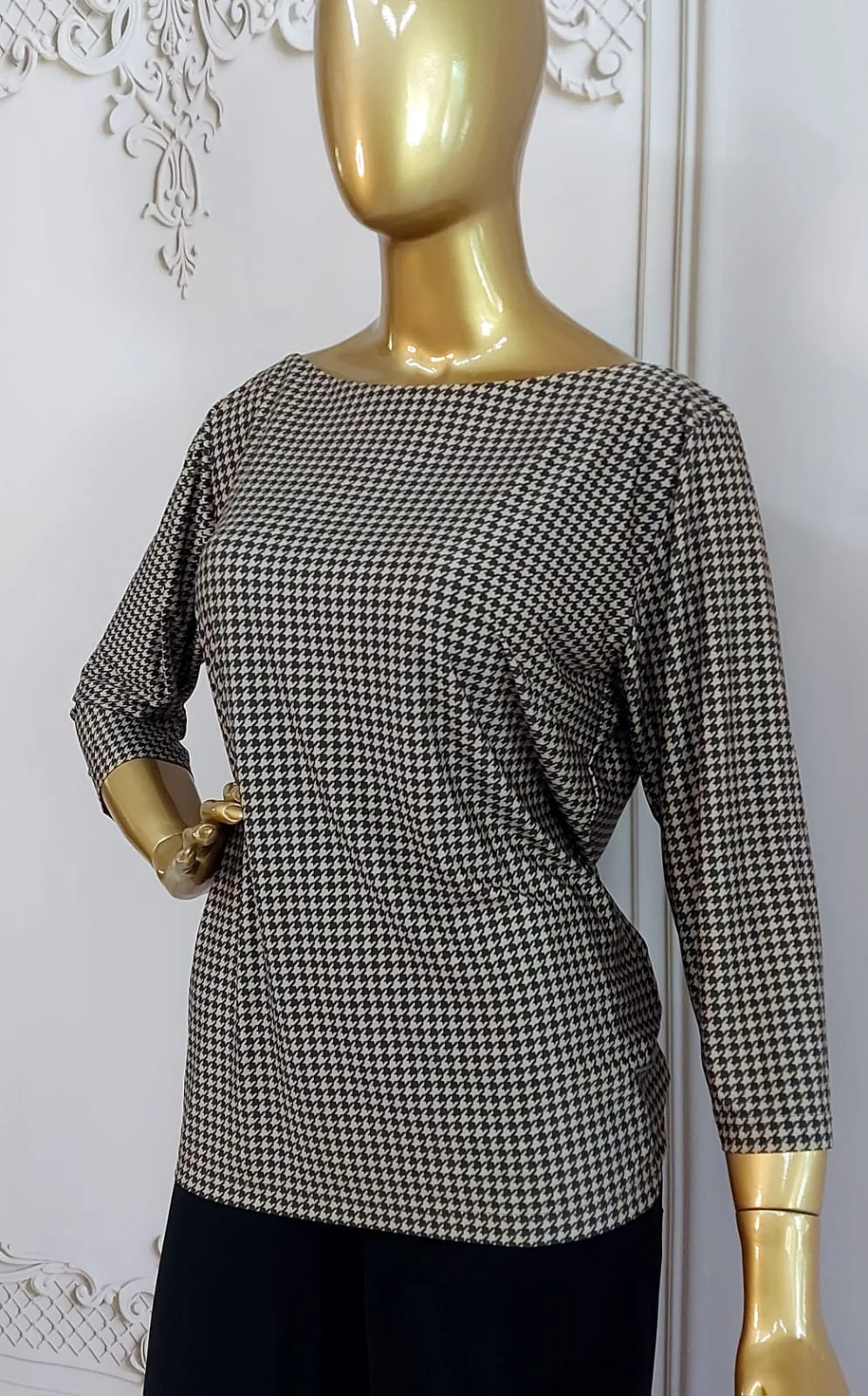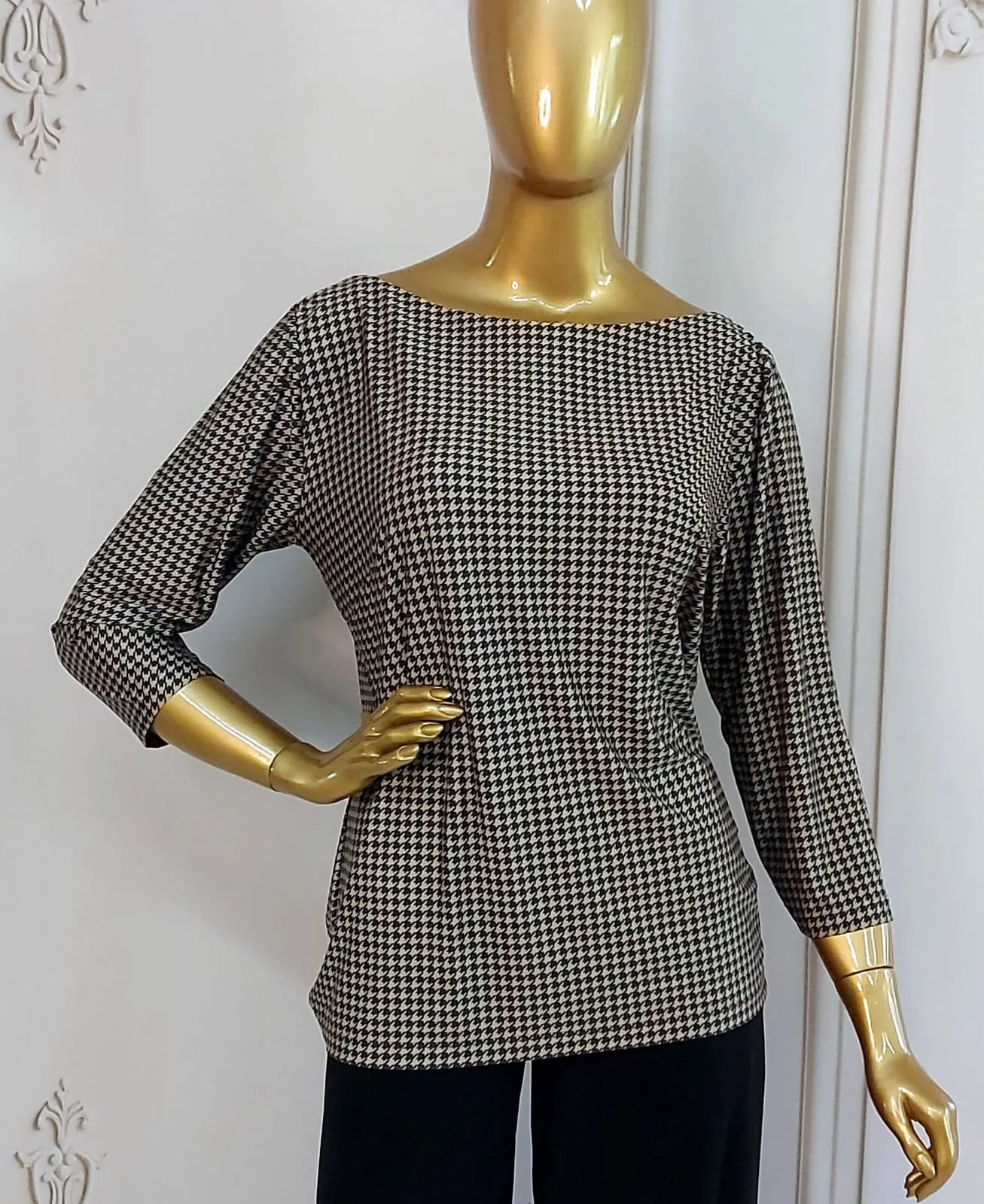 O modelo da blusa é clássico e elegante: possui mangas 3/4 e um decote canoa (bateau neck) que valoriza o colo de forma discreta e sofisticada.