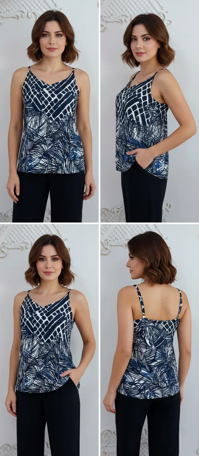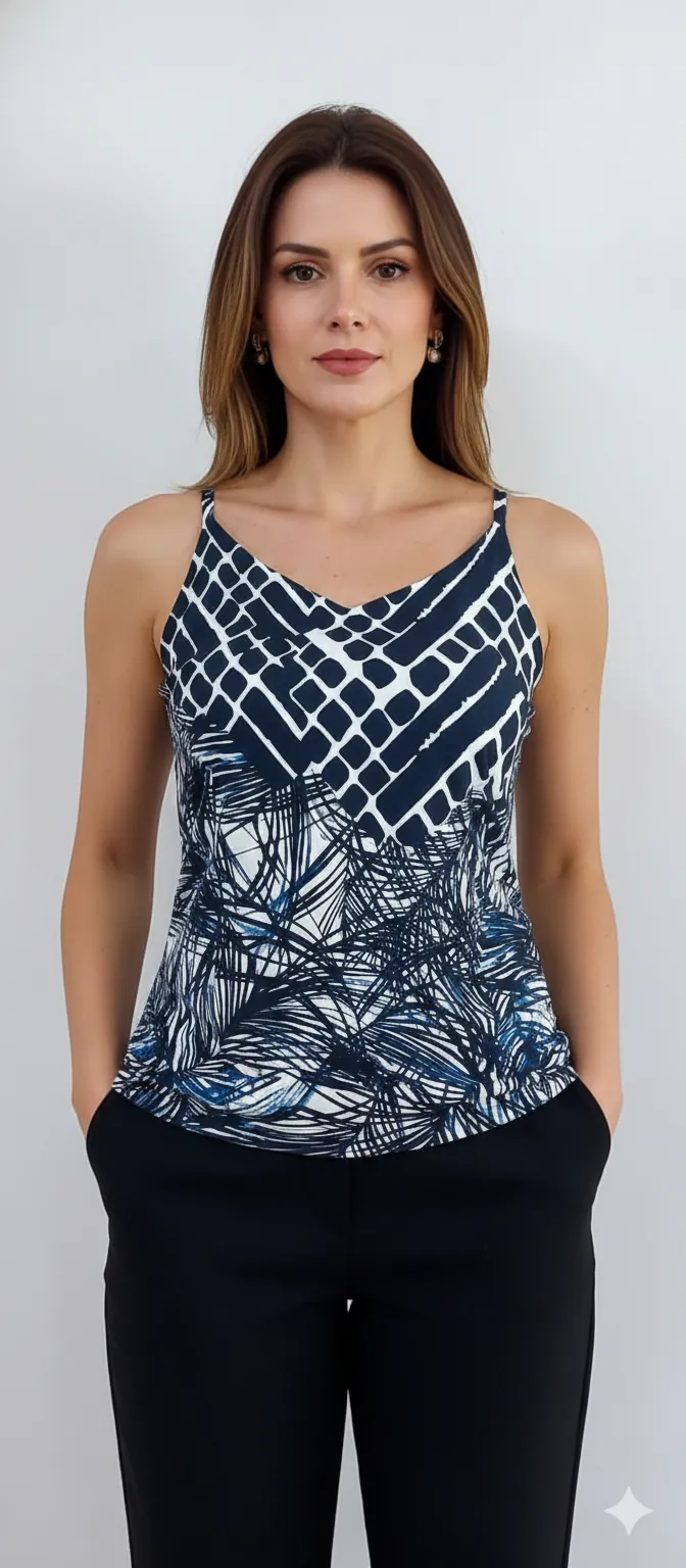 Padrão Gráfico Superior: A parte do decote e ombros apresenta um padrão geométrico em formato de “escamas” ou quadrados vazados, predominantemente nas cores Azul Marinho Escuro e Branco/Off-white.