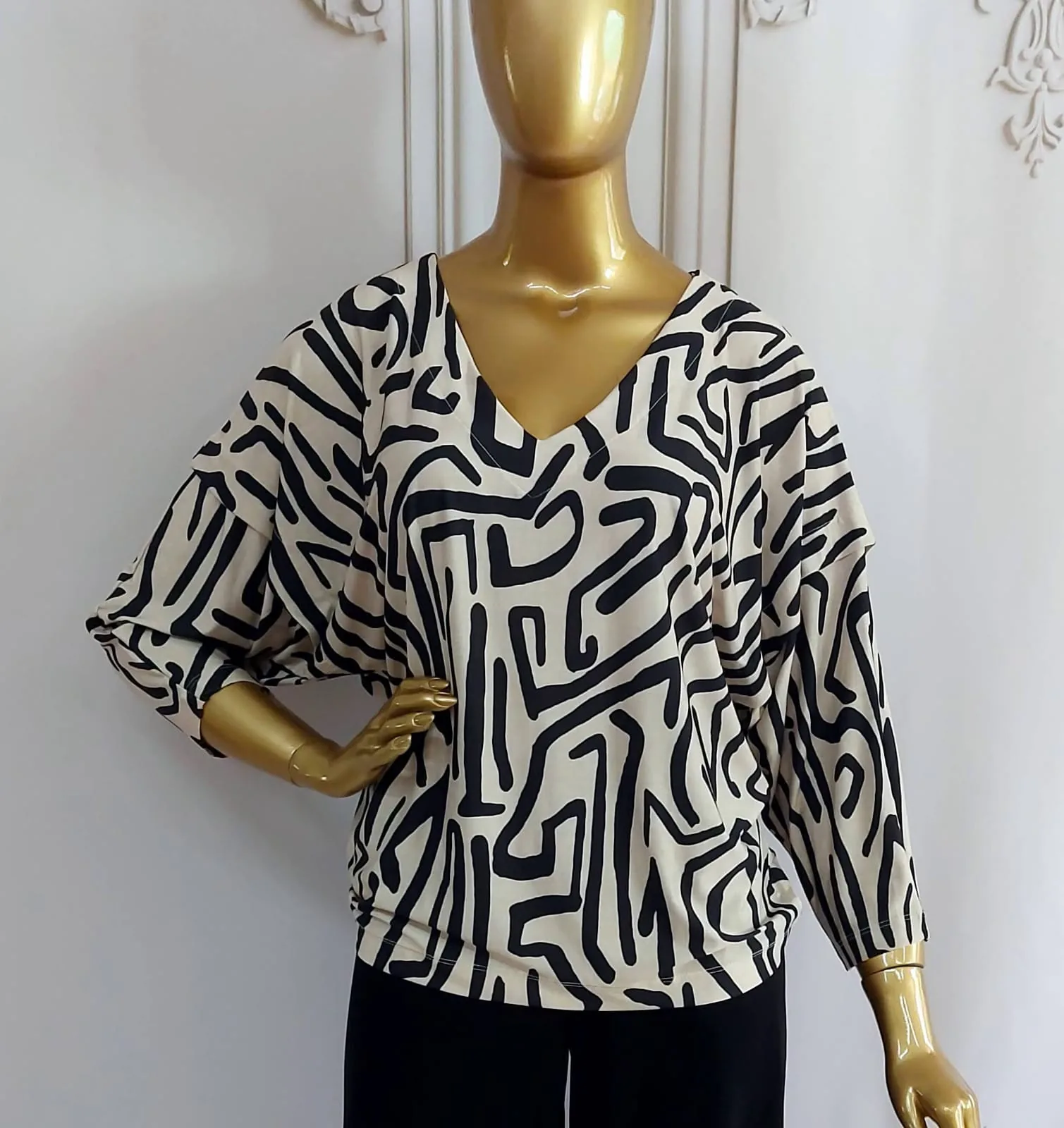 Padrão Geométrico: A estampa apresenta um desenho geométrico abstrato, composto por linhas orgânicas e traços em preto que se entrelaçam sobre um fundo bege/creme claro.