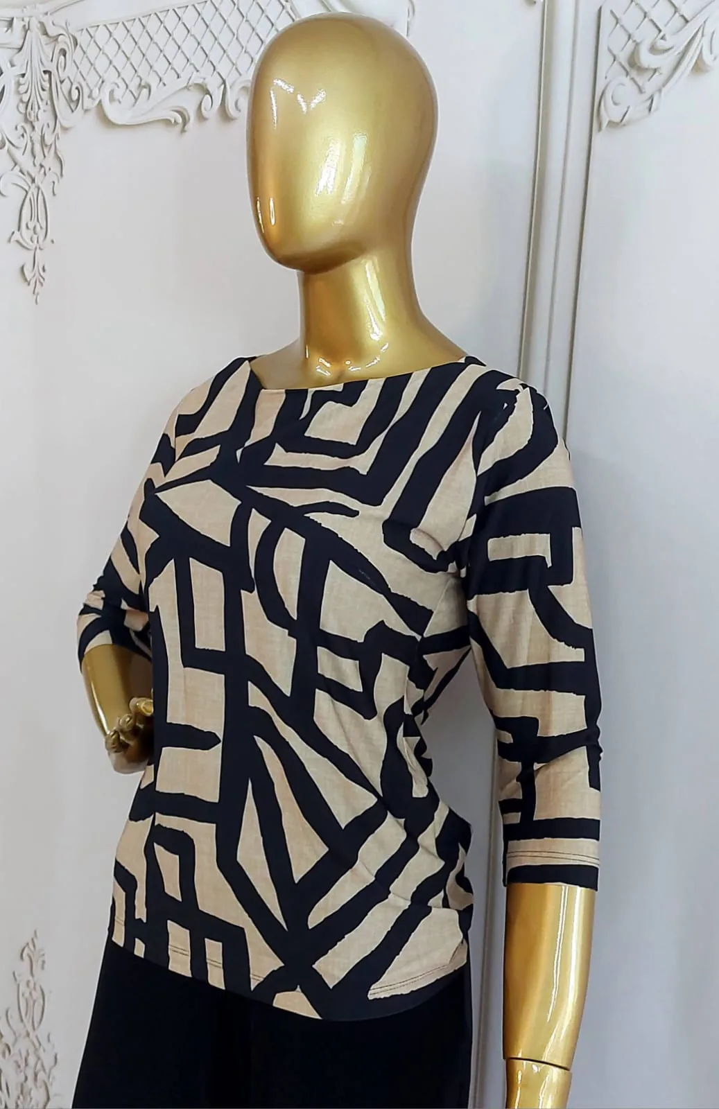 O modelo da blusa é clássico e atemporal, apresentando mangas 3/4 e um elegante decote canoa (bateau neck), que valoriza o colo de forma discreta.
