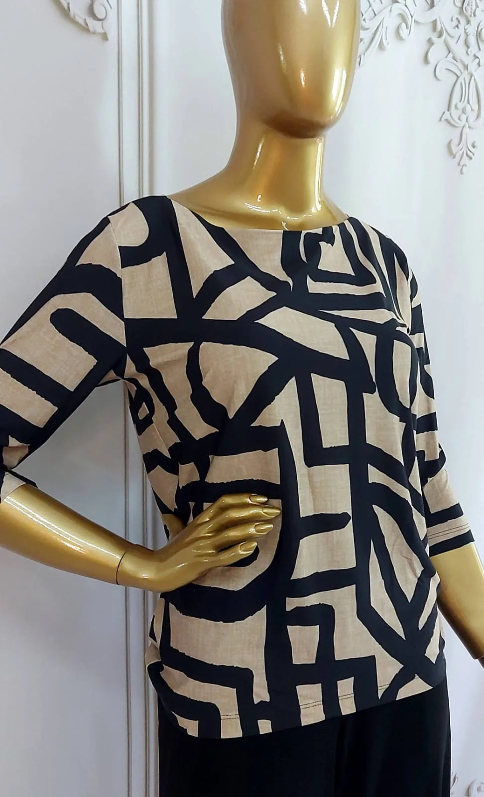 Design: Blusa Manga 3/4 com Decote Canoa, clássico e elegante.