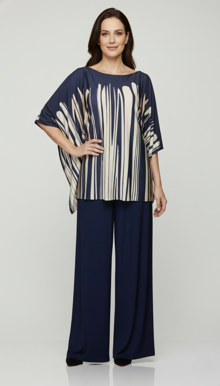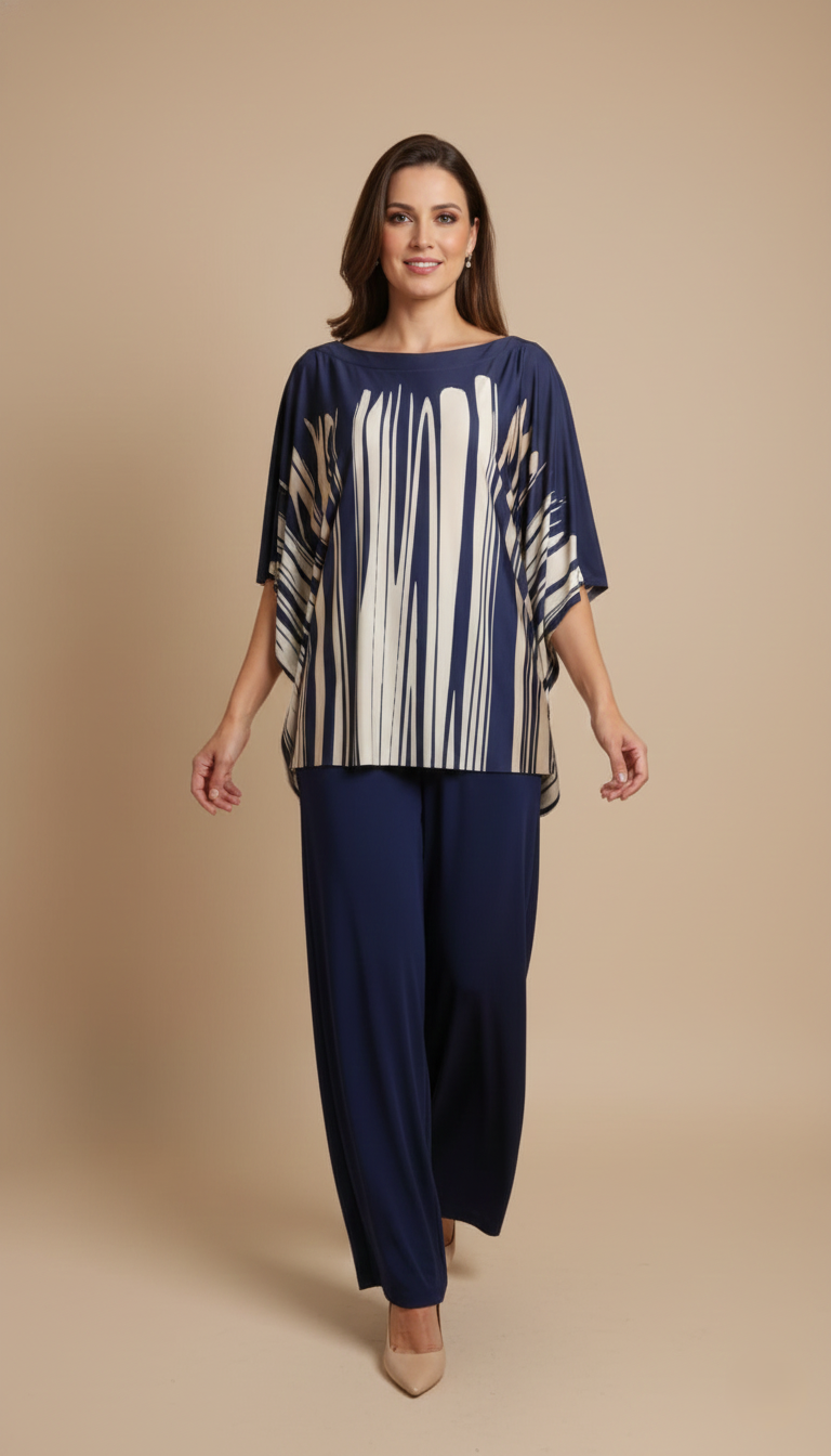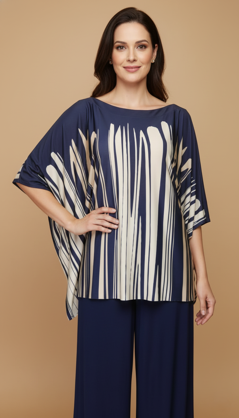 A estampa exclusiva é um dos grandes destaques: um mix de linhas verticais orgânicas em tons de marinho profundo e off-white suave, harmonizadas de forma artística para alongar a silhueta e garantir um efeito visual elegante. As cores foram escolhidas para transmitir sofisticação, além de serem fáceis de combinar com calças, saias ou peças lisas em tons neutros ou contrastantes.