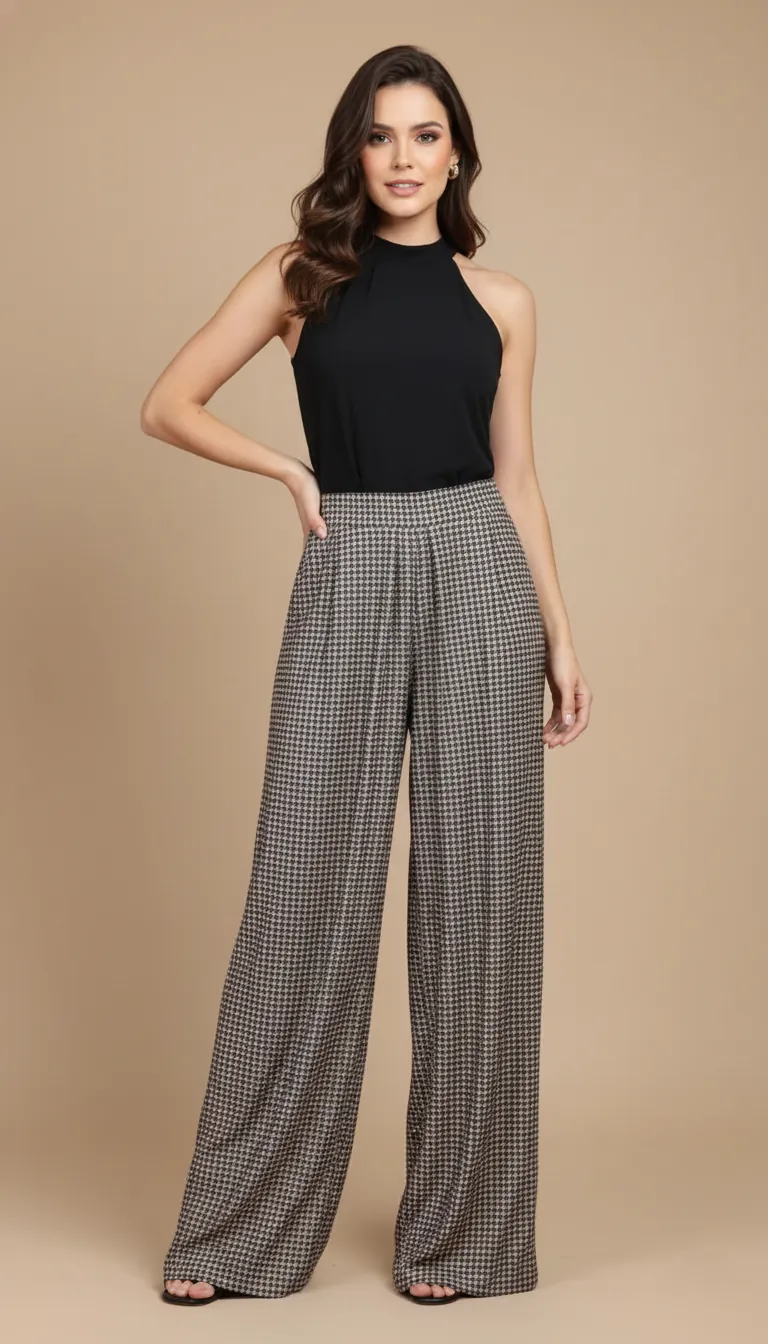 Eleve seu guarda-roupa com a Calça Pantalona Feminina da NovaCasih, uma peça que une o conforto inigualável da malha fluity premium ao charme atemporal da estampa pied de poule. Esta é a escolha perfeita para quem busca moda feminina com elegância, versatilidade e caimento impecável.