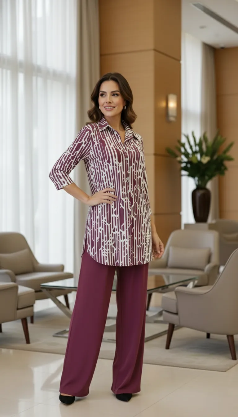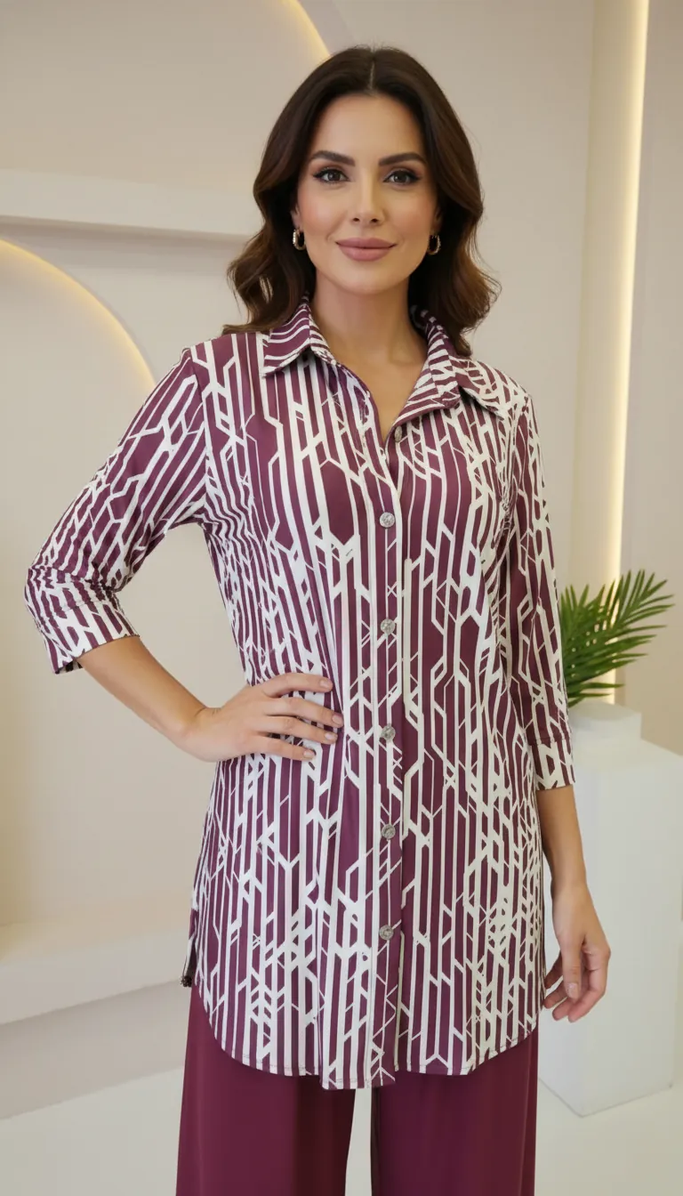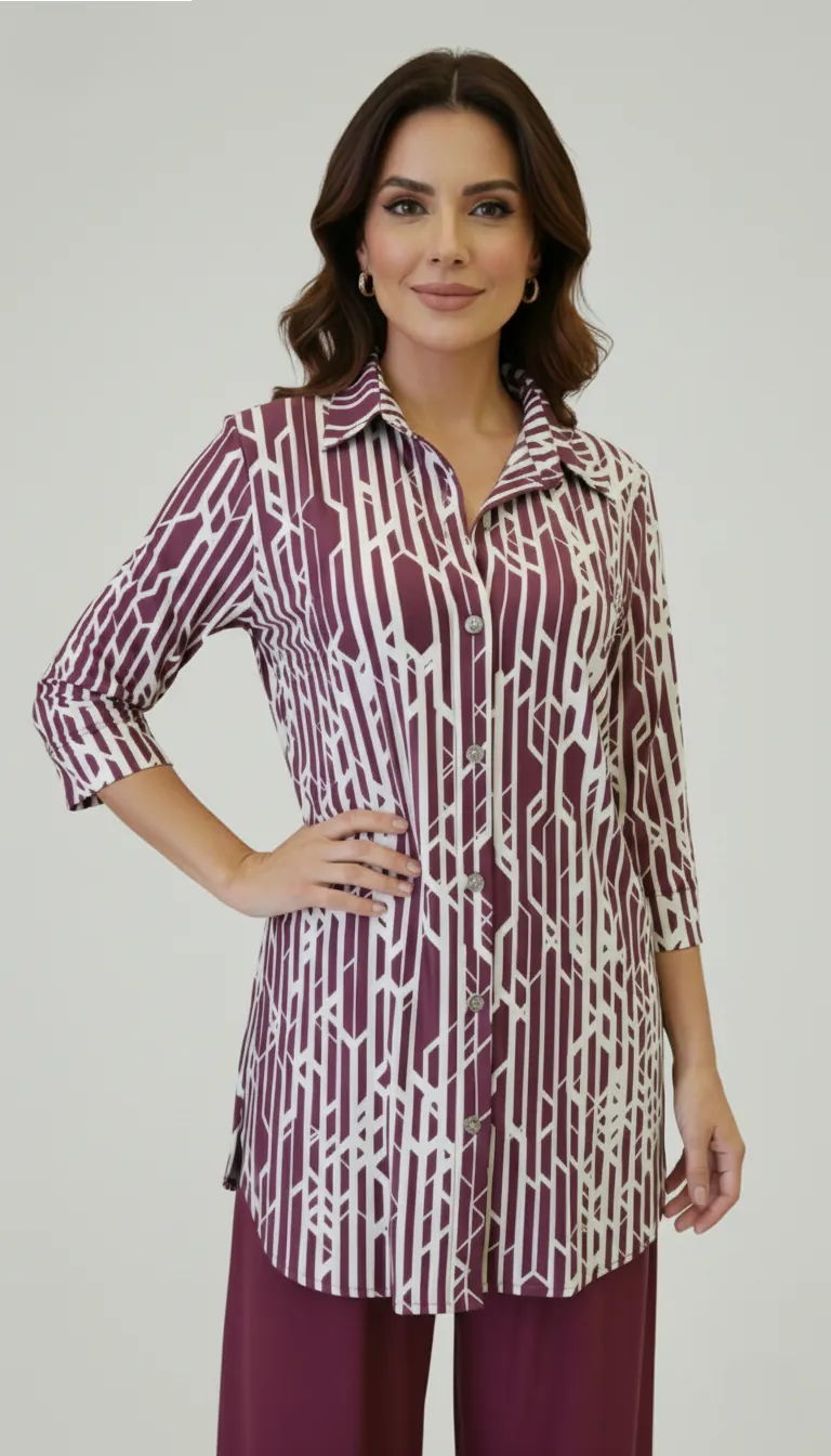 Modelagem: Camisa Longa (túnica) com corte reto e alongado, oferecendo cobertura ideal e alongando a silhueta.