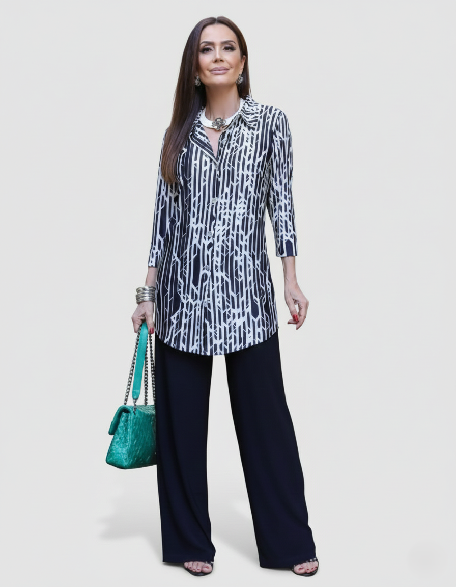 Modelagem: Camisa Longa (túnica) com corte reto e alongado, oferecendo cobertura ideal e alongando a silhueta.