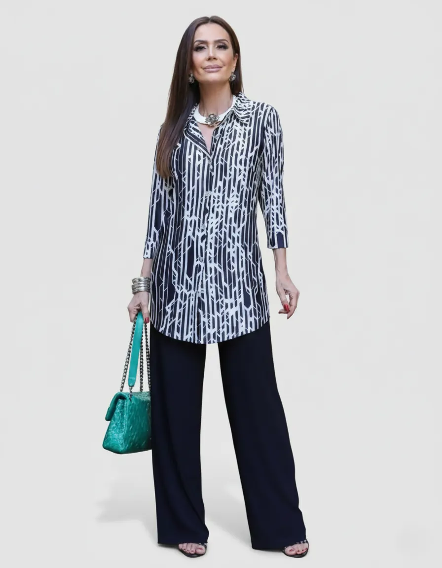 • Modelagem: Camisa Longa (túnica) com corte reto e alongado, oferecendo cobertura ideal e alongando a silhueta.