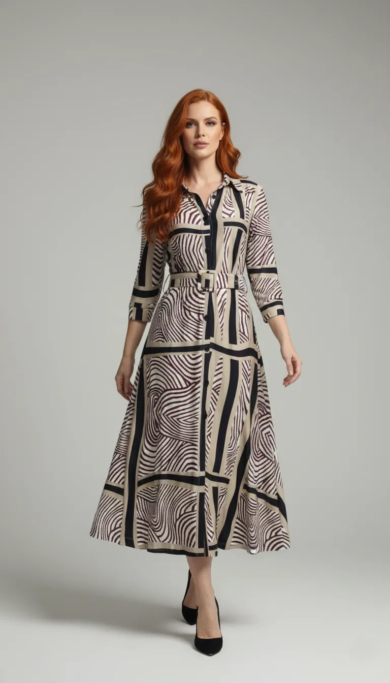 Este vestido é a escolha ideal para a mulher que busca a praticidade da camisaria aliada ao conforto de luxo e a um design de alta moda. O padrão gráfico e a modelagem acinturada criam um visual de alto impacto e refinamento urbano.