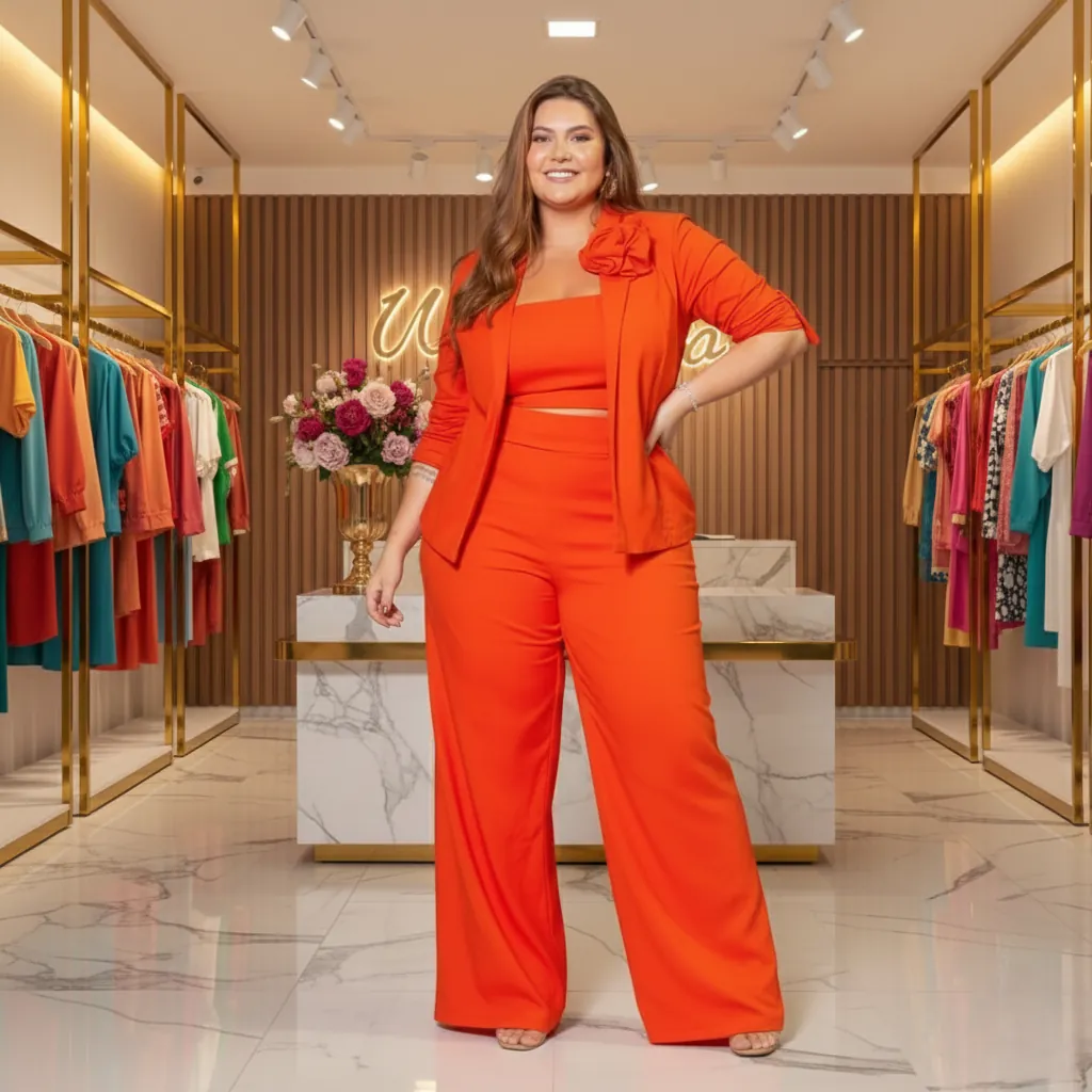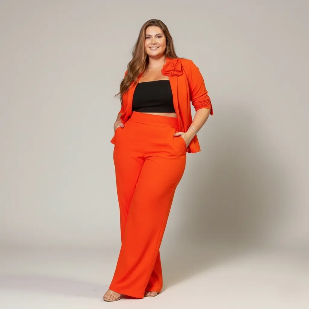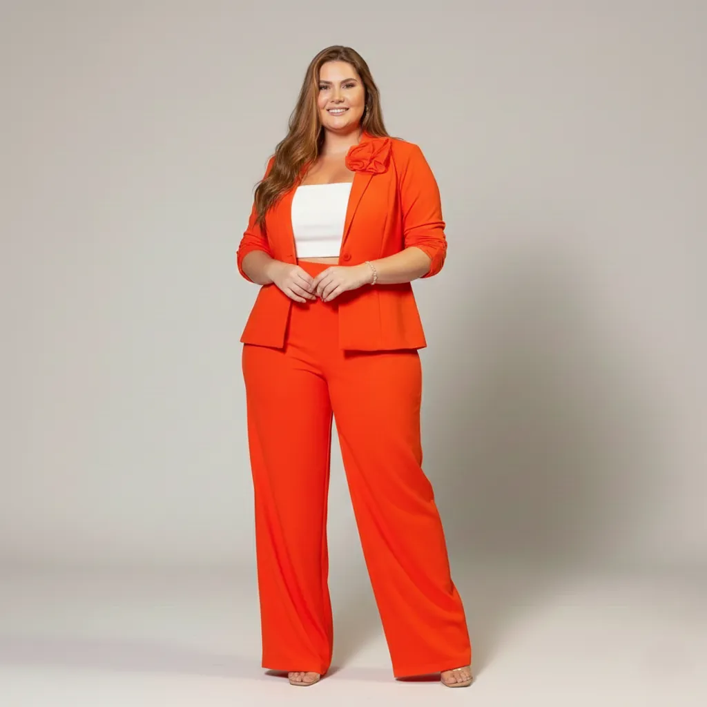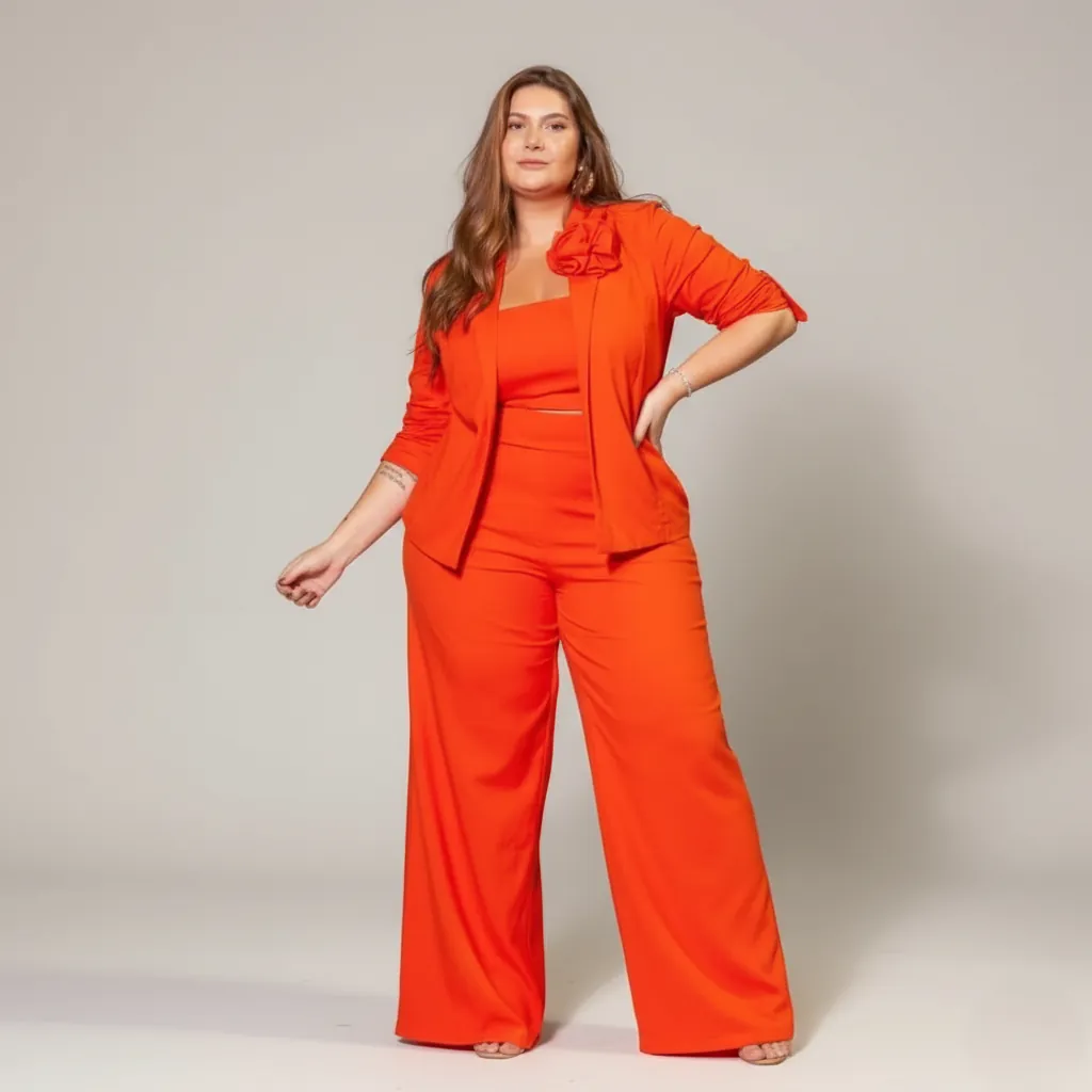 “Deslumbre com o Conjunto Alfaiataria Laranja Amanhecer! Blazer com flor (opcional) e calça pantalona de linho e viscose. Conforto, estilo e sofisticação para todas as ocasiões. Adquira já