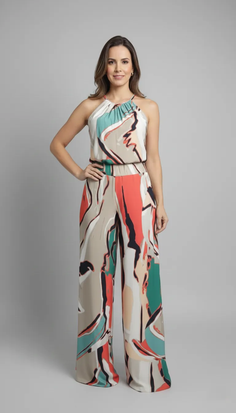 Blusa Halter: O Decote Halter Neck (alças finas com leve franzido na gola) valoriza os ombros e o colo. O detalhe de um Adereço Dourado no decote adiciona um ponto de luz e requinte, dispensando colares.