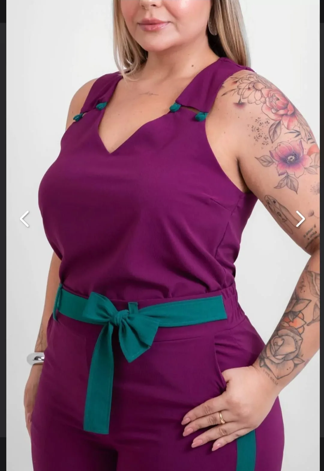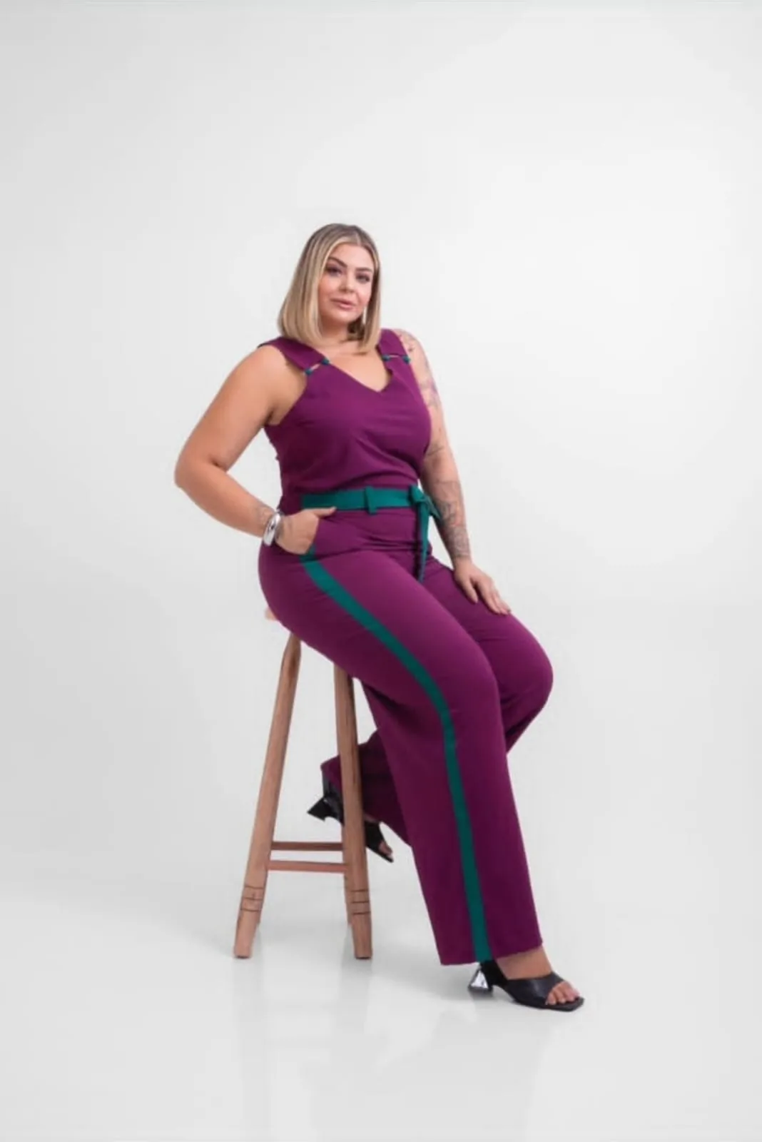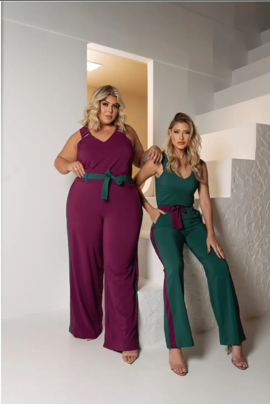 Conjunto calça e blusa cor roxo, modelagem Plus Size.