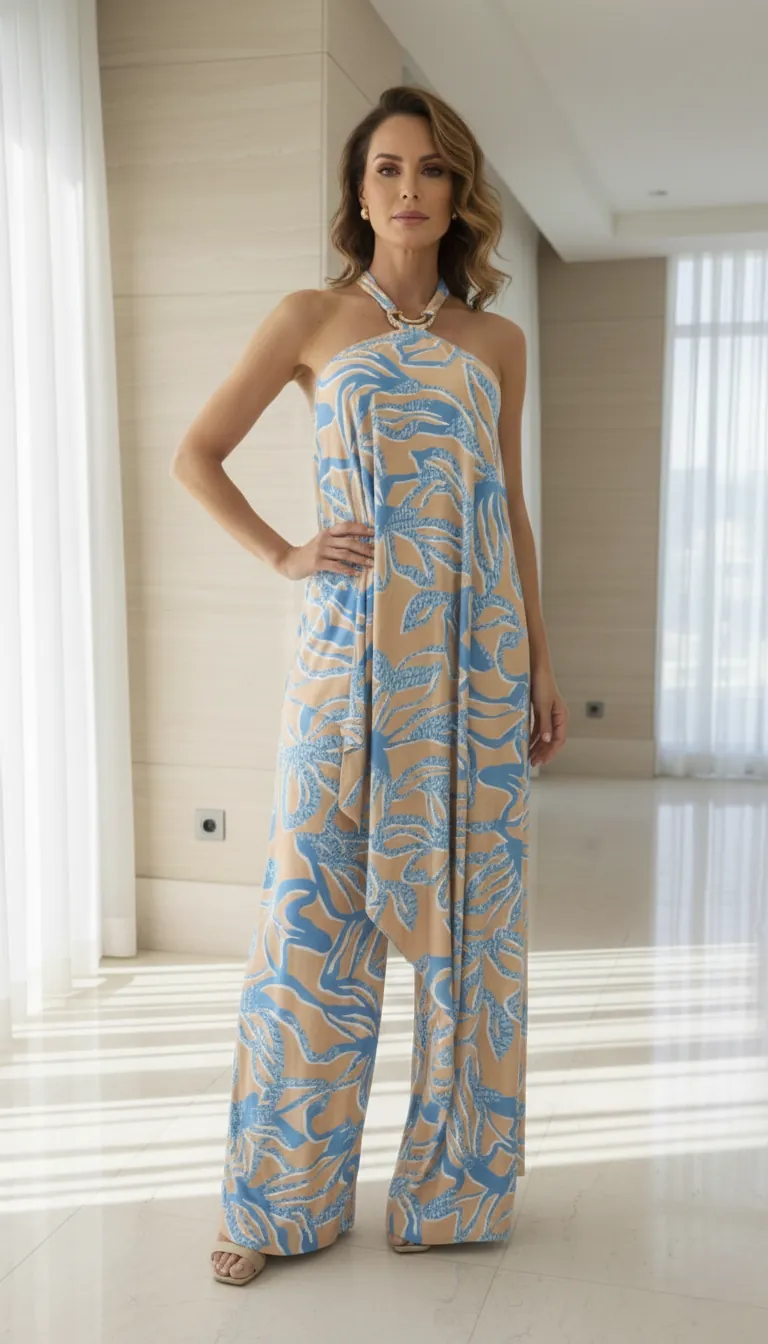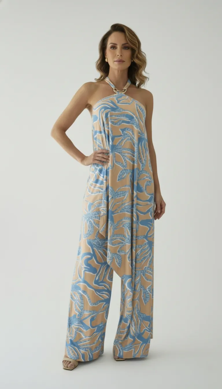 O top halter traz decote delicado com amarração no pescoço e leve drapeado no busto, oferecendo um caimento elegante e discreto. A peça superior tem corte amplo que proporciona movimento e modernidade; o detalhe metálico na amarração realça o colo com sofisticação sutil. A calça fluida, em corte largo e comprimento longo, complementa a composição com um balanço natural que alonga a silhueta.
