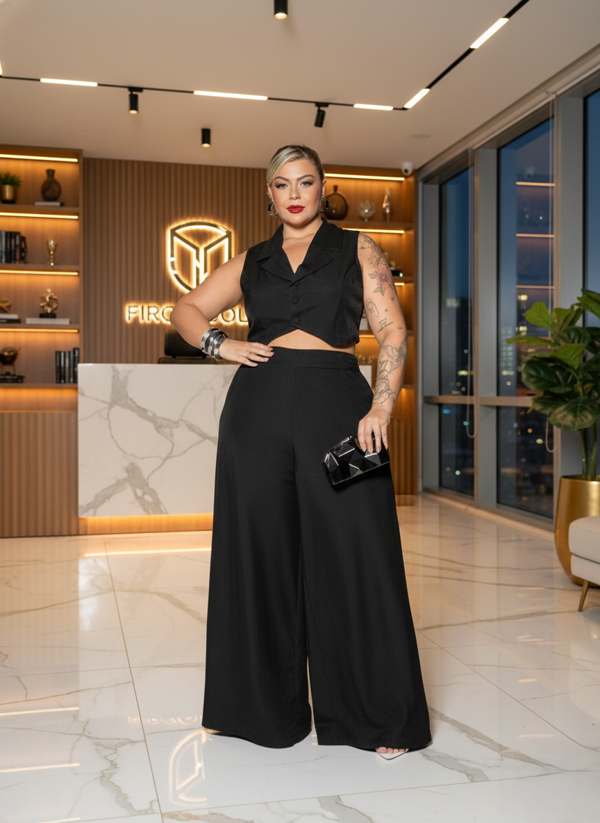 “Descubra a perfeição da alfaiataria no Conjunto Excellence Plus Size. Com pantalona dupla e cropped estruturado, ele redefine a elegância com um caimento que alonga e esculpe. Vista a exclusividade que você merece.”