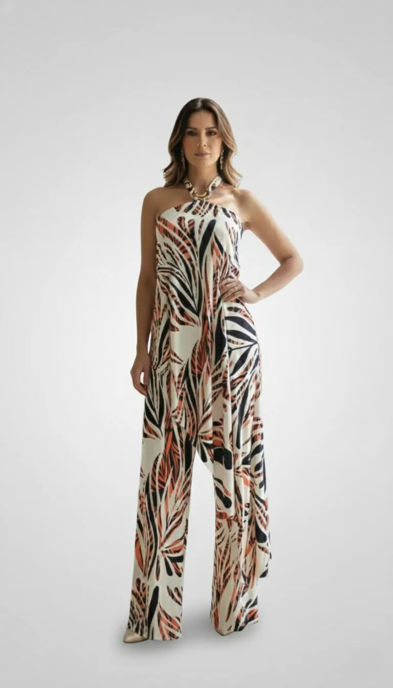 O top halter traz decote delicado com amarração no pescoço e leve drapeado no busto, oferecendo um caimento elegante e discreto. A peça superior tem corte amplo que proporciona movimento e modernidade; o detalhe metálico na amarração realça o colo com sofisticação sutil. A calça fluida, em corte largo e comprimento longo, complementa a composição com um balanço natural que alonga a silhueta.
