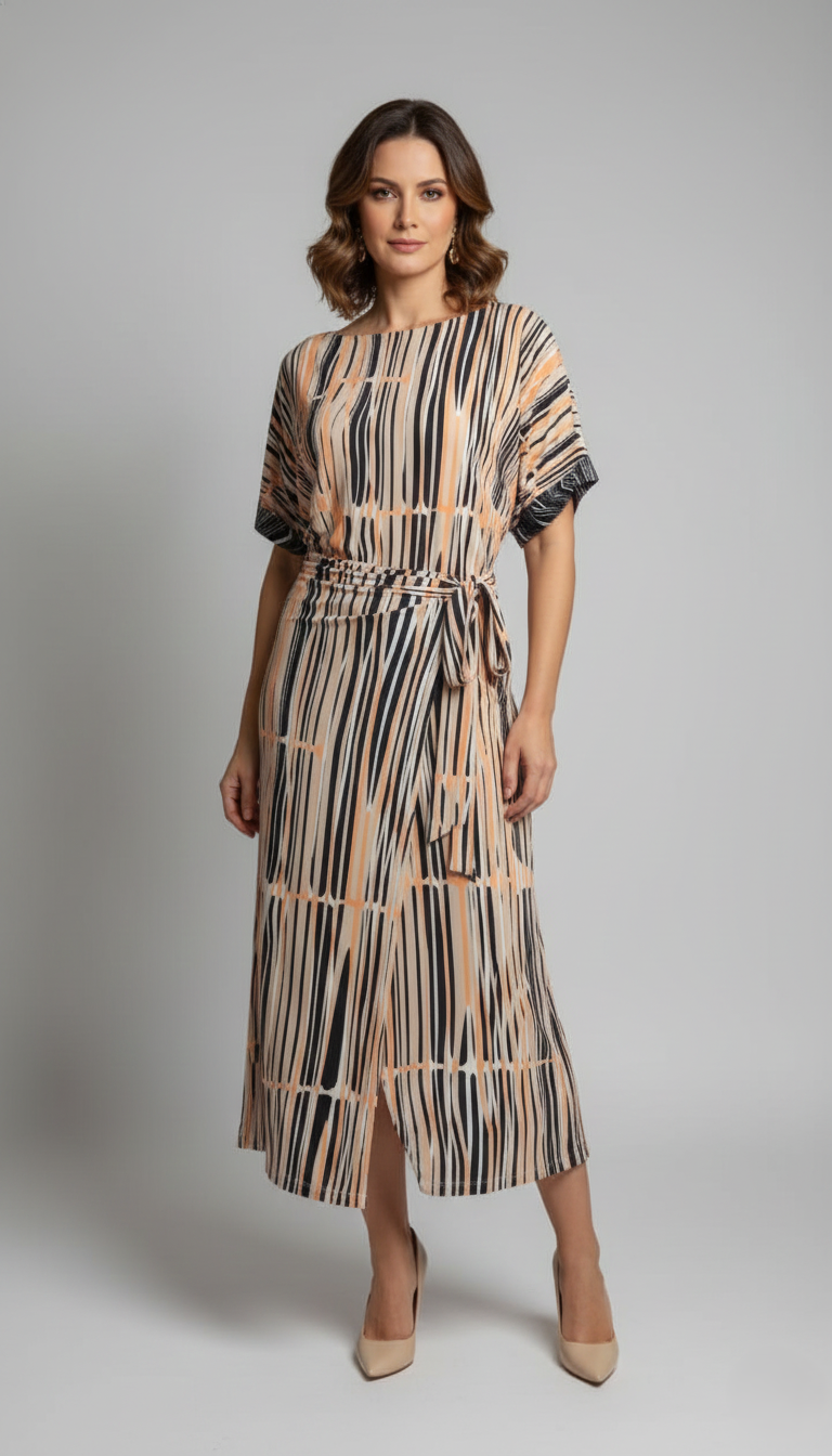 Estampa Exclusiva: O conjunto é realçado por uma estampa exclusiva de alto contraste, com traços verticais abstratos em uma paleta elegante que harmoniza o Preto e o Off-White com o vibrante Coral/Laranja Pêssego, criando um efeito visual alongador e dinâmico.