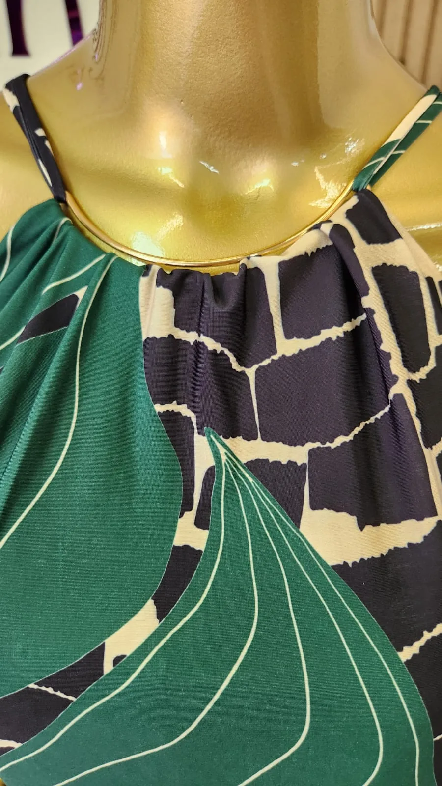 • Estampa: Tropical/Orgânica (tons de verde, off-white, preto).