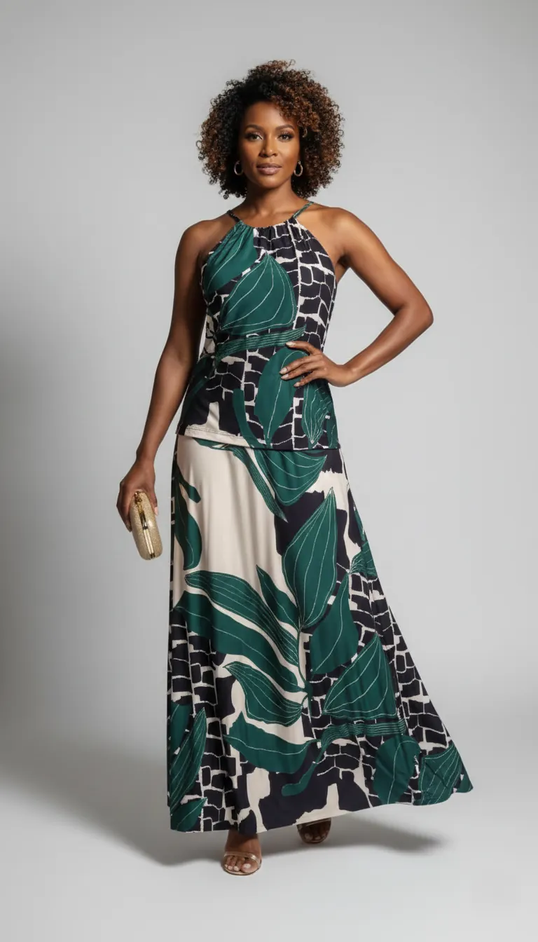 Conjunto Longo Lara Tropical Elegance  (Blusa Halter com Adereço Dourado e Saia Longa)
