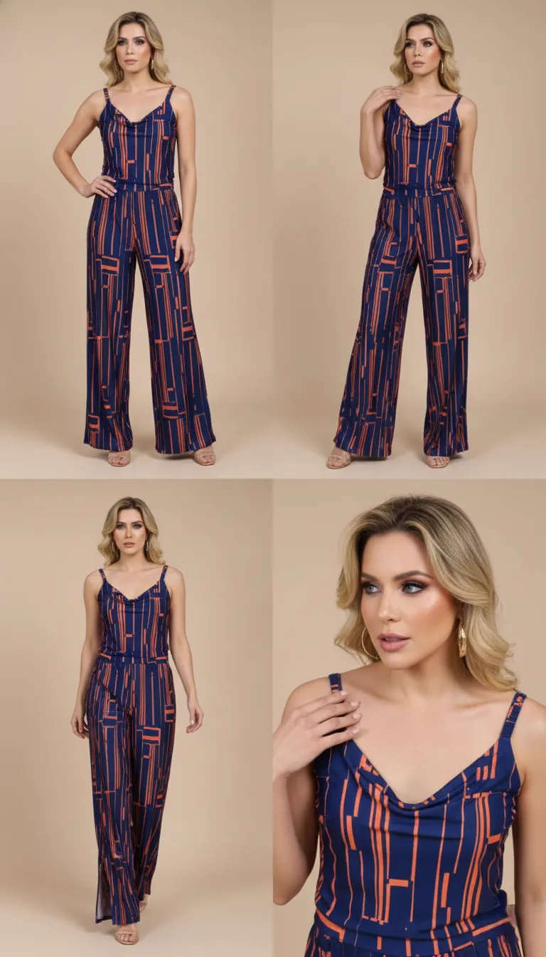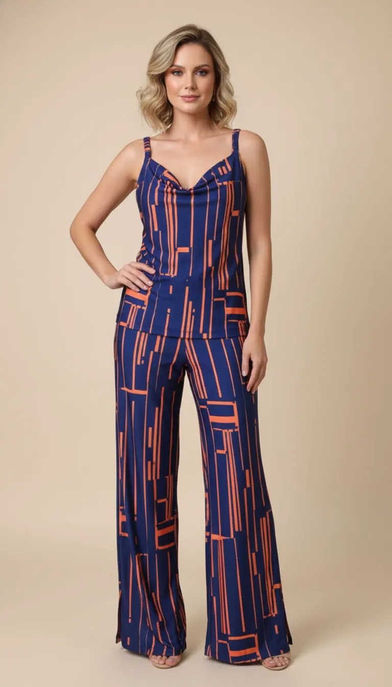 • Cores: O contraste é criado pelo fundo em azul-marinho profundo, uma cor clássica e sofisticada, que realça as formas em laranja/coral intenso e vibrante. Esta harmonia das cores confere ao conjunto uma identidade visual marcante e atemporal, ideal para quem busca um conjunto estampa exclusiva.