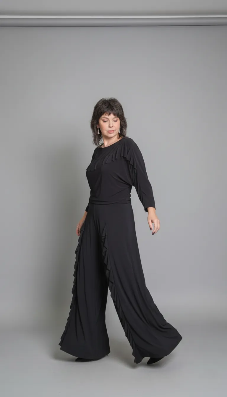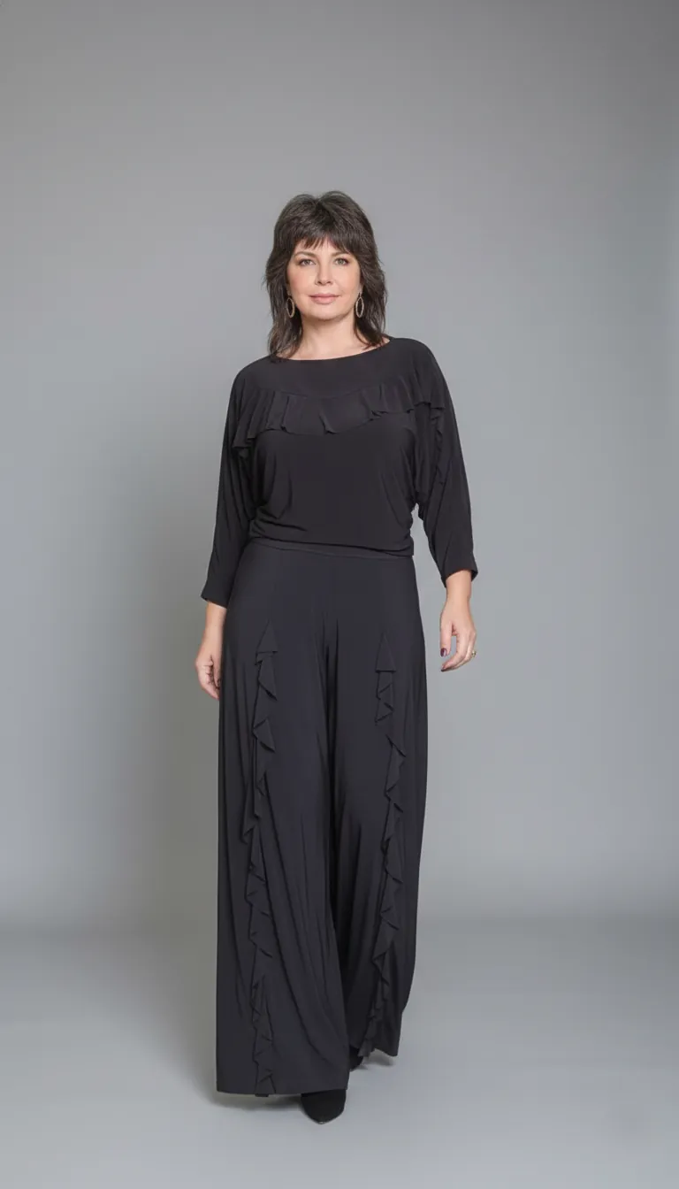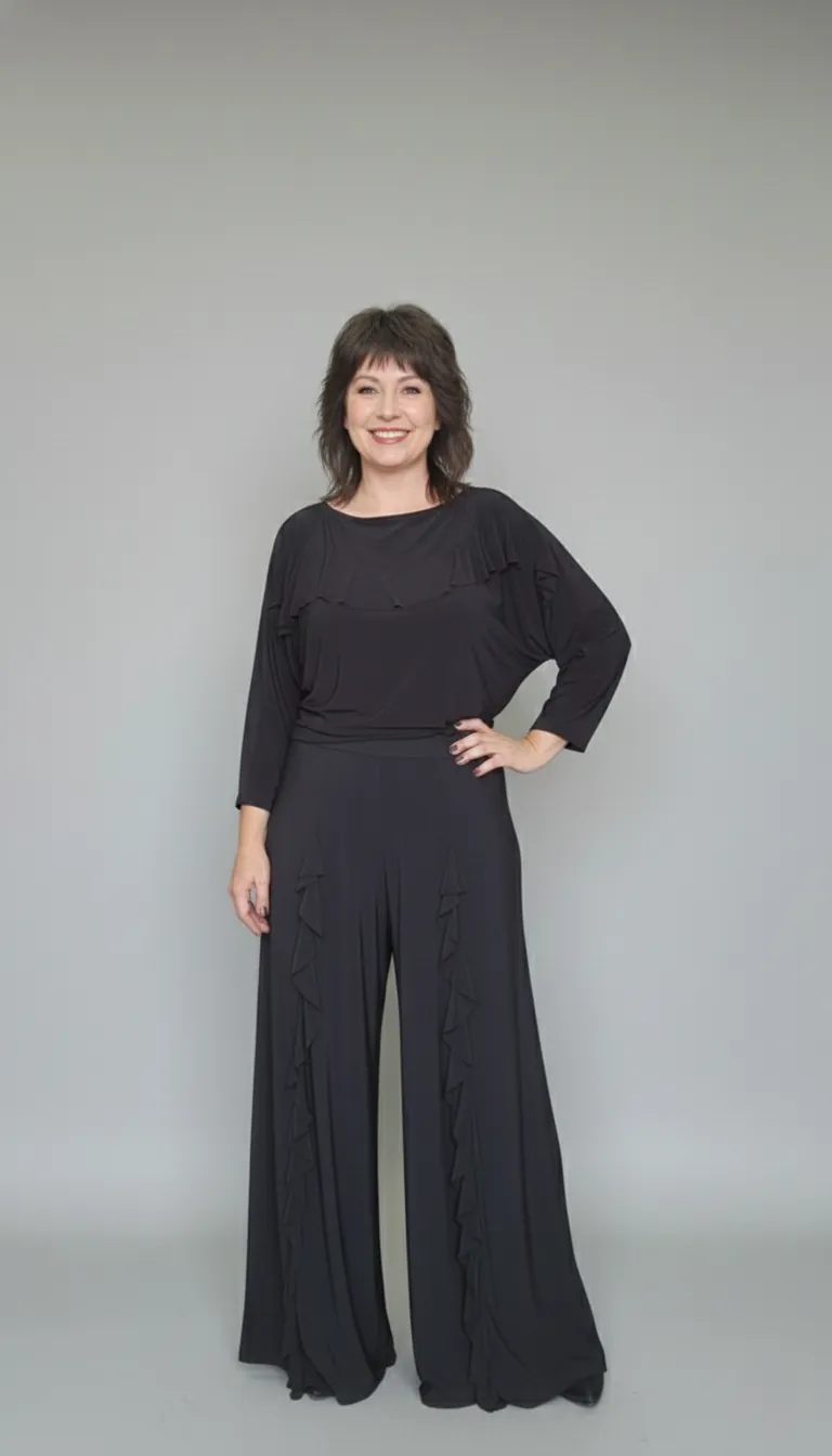• Pantalona de Movimento: Modelagem super fluida com pala larga no cós para definição da cintura e babados verticais que alongam a silhueta, bolsos nas laterais (faca).