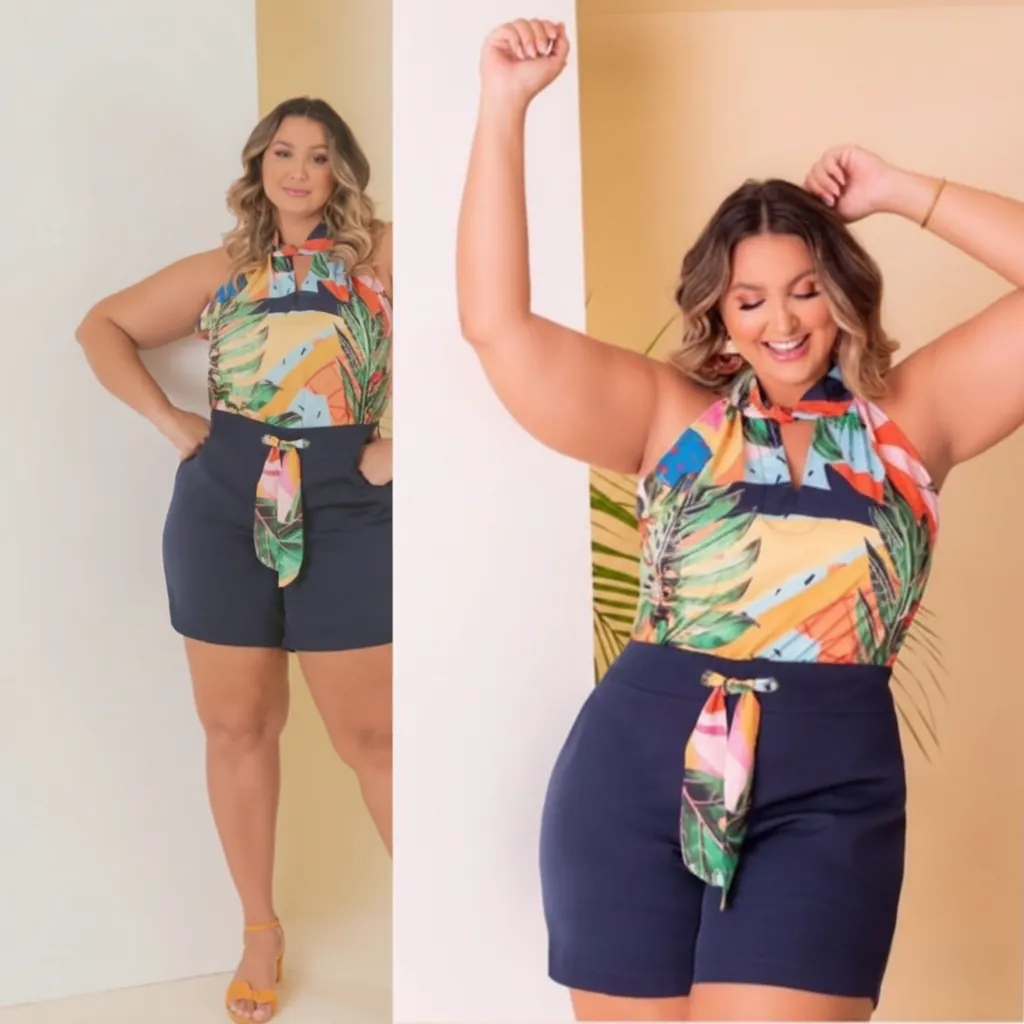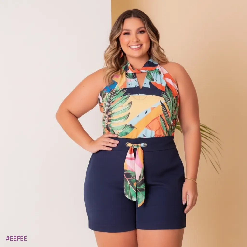 Este conjunto foi meticulosamente desenvolvido para a mulher que busca a união entre o frescor das estampas botânicas e o rigor da alfaiataria premium, garantindo um caimento impecável para a silhueta plus size.