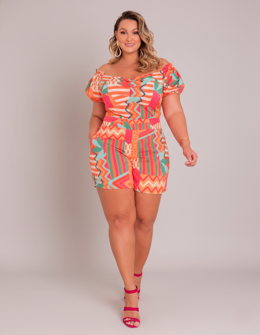 Conjunto feminino plus size em tecido toque de seda, composto por blusa ombro a ombro com decote valorizado e mangas curtas bufantes e shorts com pala larga, bolso faca nas laterais e fechamento em zíper nas costas. Modelagem confortável que valoriza as curvas, com estampa moderna e cores vibrantes.