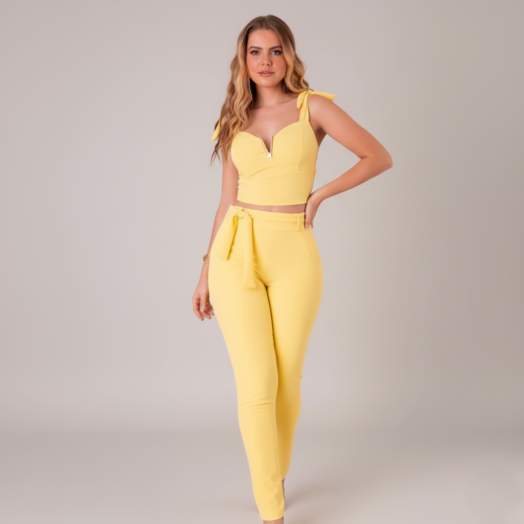 Inaugure uma nova era de sofisticação com o Conjunto Modinha Solar Gold. Em um tom de amarelo vibrante e iluminado, este duo é a personificação do glamour contemporâneo. Confeccionado em tecido com tecnologia de memória elástica, as peças se moldam perfeitamente ao corpo, oferecendo uma compressão inteligente que valoriza as curvas sem perder a estrutura original da alfaiataria.