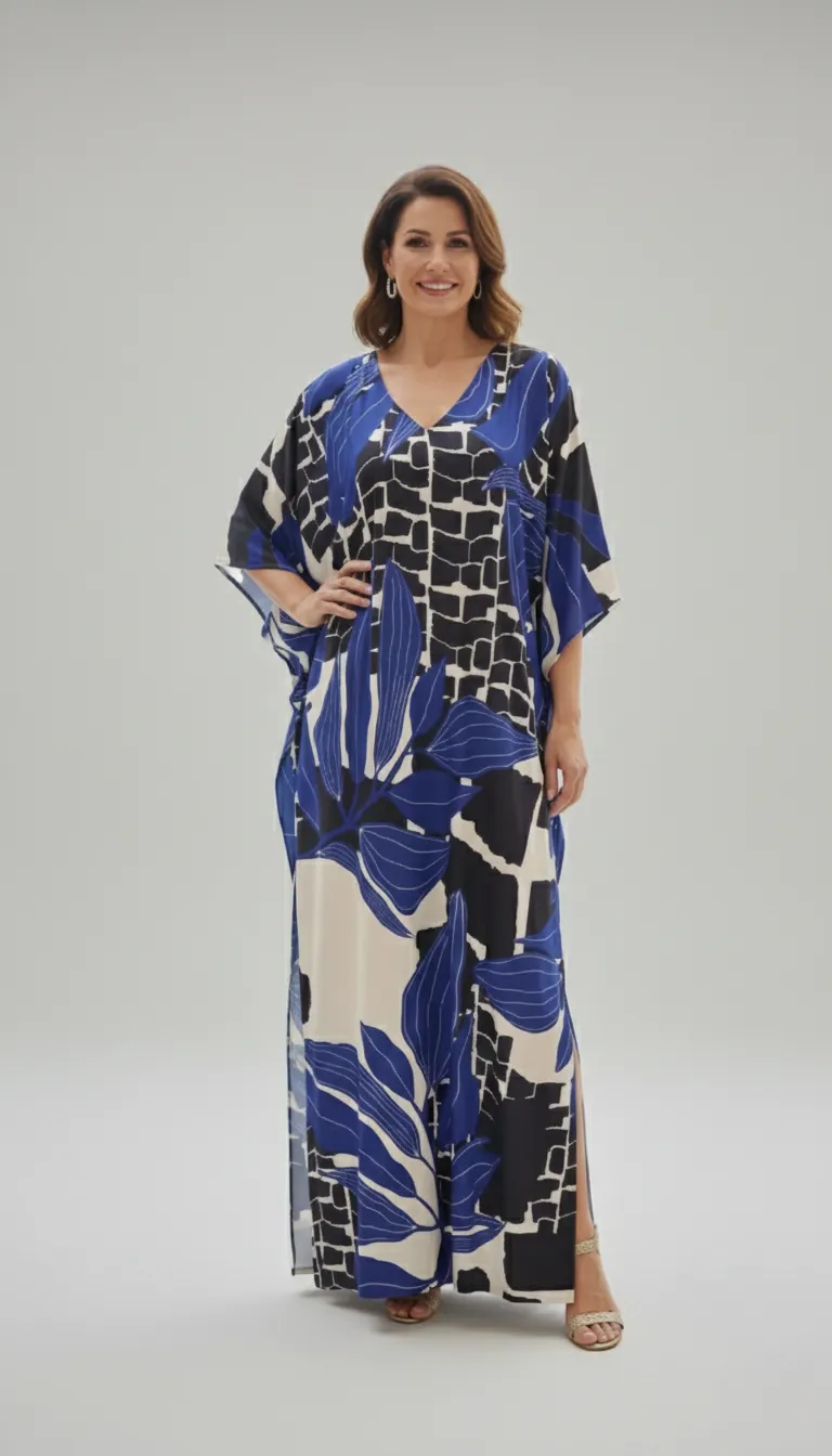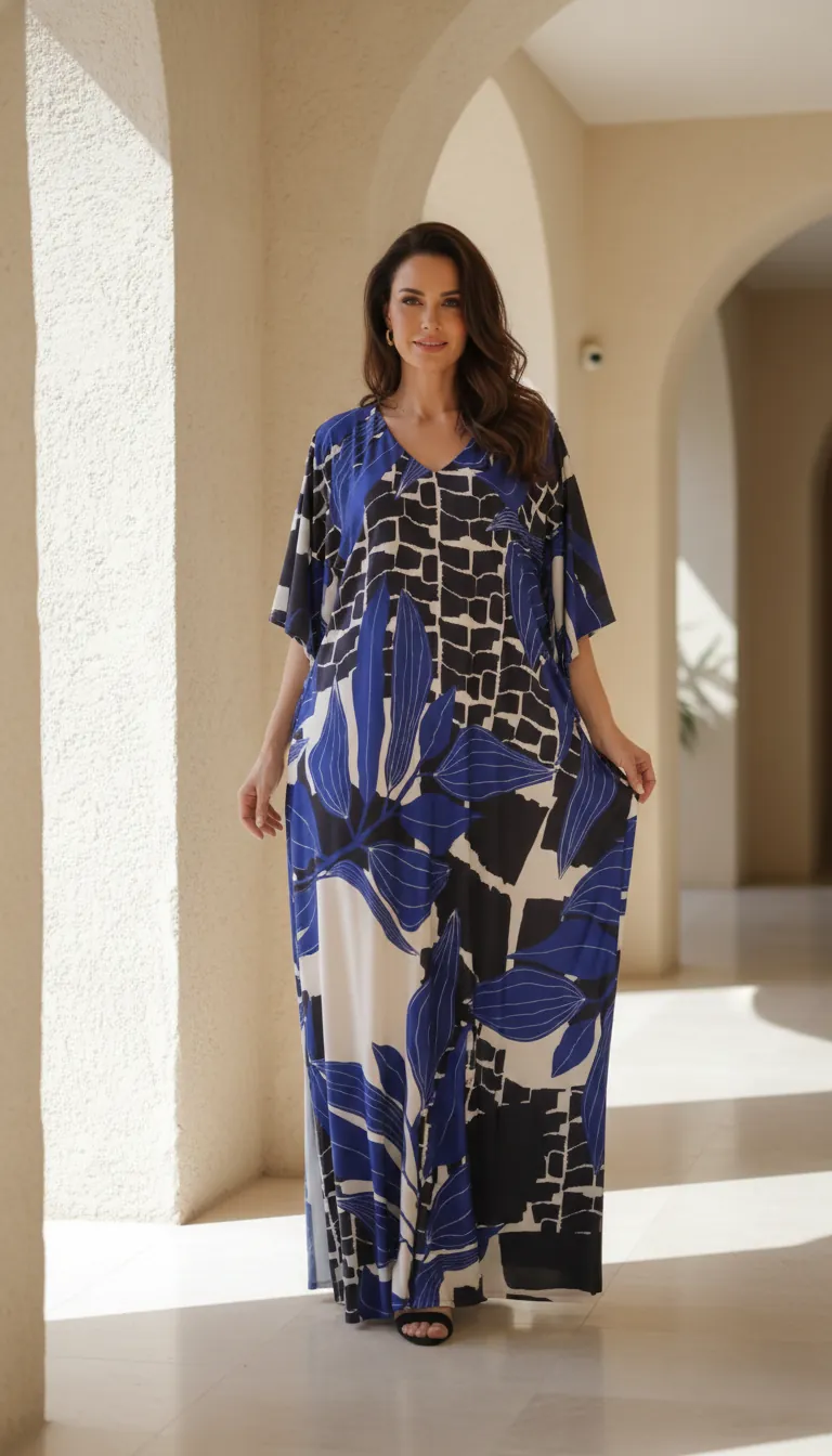 Kaftan Longo da NovaCasih, uma peça que une sofisticação, conforto e exclusividade, perfeita para a mulher moderna que valoriza o caimento impecável.
