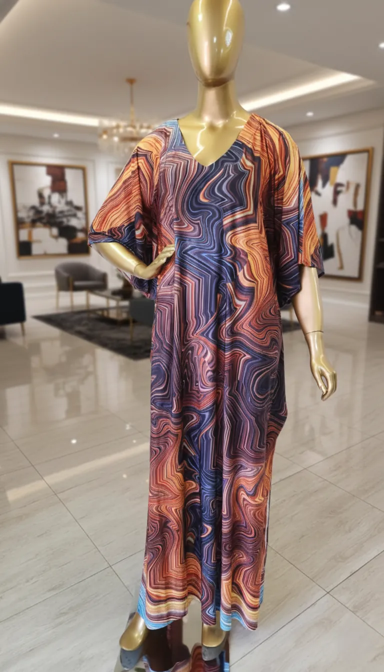 O kaftan longo Elisa com manga raglan é uma peça memorável e luxuosa, que evoca o visual de pedras preciosas e cria um efeito hipnotizante com sua estampa orgânica. É a escolha perfeita para quem deseja uma peça statement que une arte, conforto e sofisticação.