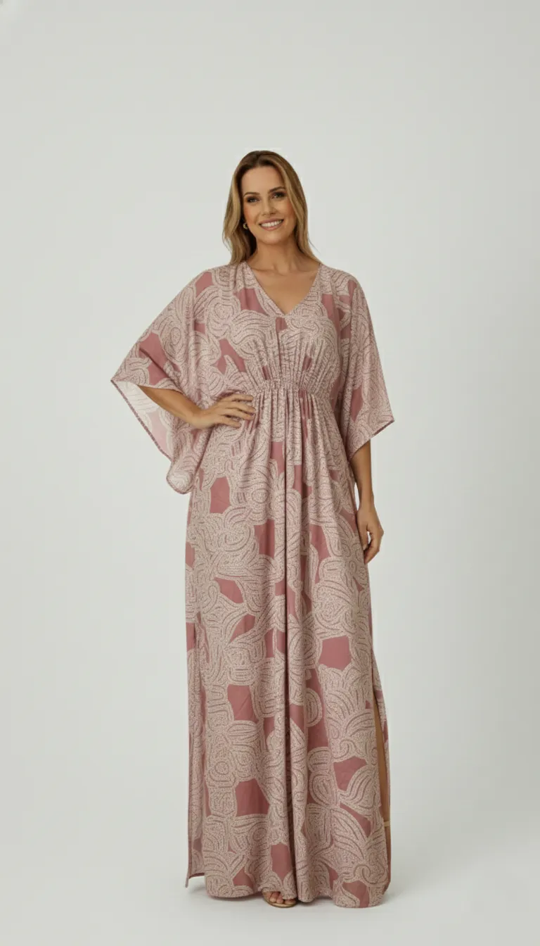• Dica: O franzido sutil na cintura permite que o caftan mantenha o volume da saia sem perder a forma do corpo.