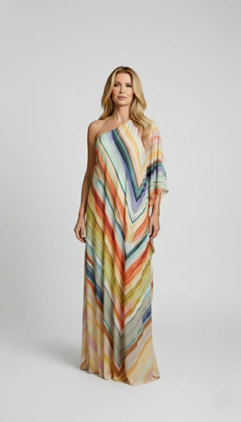 O kaftan longo de um ombro só é uma peça que exala romantismo e leveza em cada detalhe. Confeccionado em tecido maleável premium, envolve o corpo com suavidade, oferecendo caimento fluido e toque delicado que traduzem conforto e elegância.