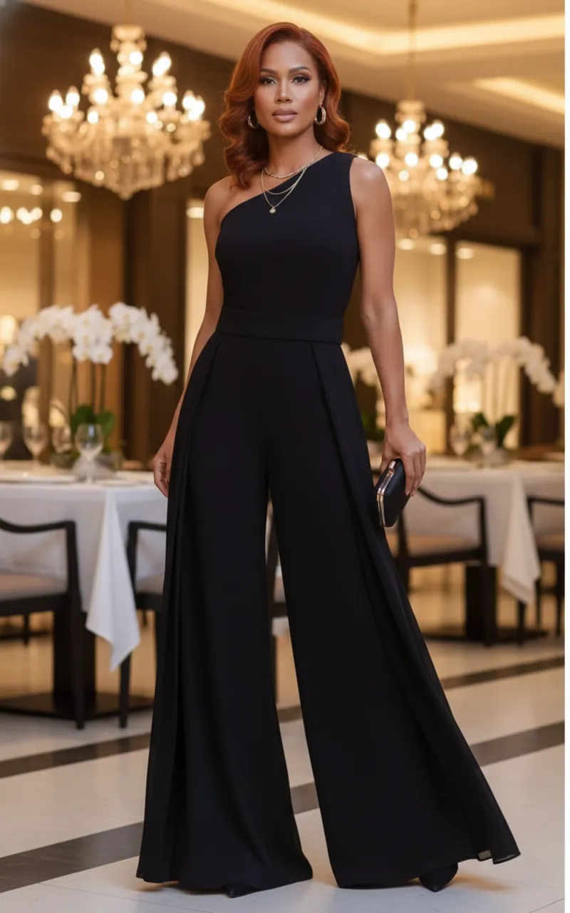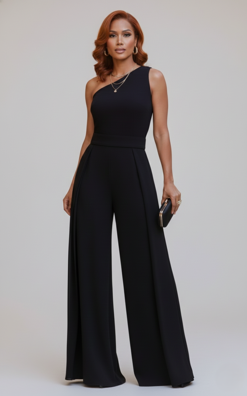 Elegância atemporal. Macacão preto liso ombro único com caimento impecável para ocasiões que exigem sofisticação.