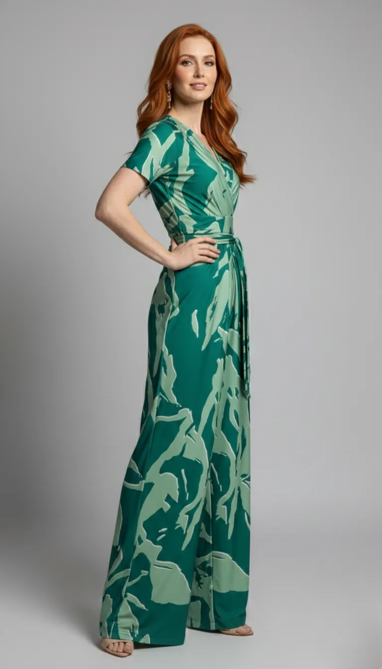 Peça única de caimento fluido: macacão transpassado com estampa exclusiva em tons de verde e mangas curtas.