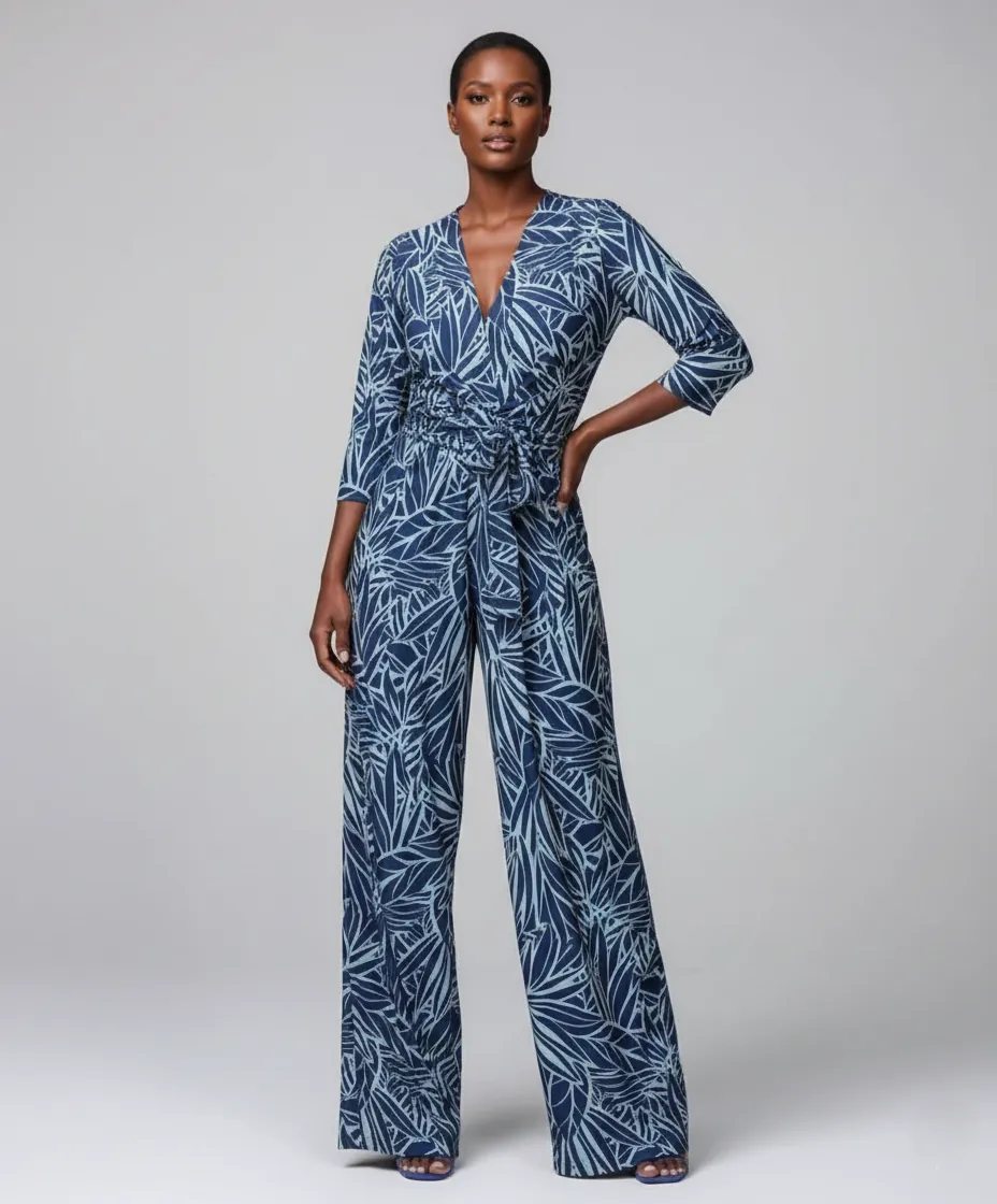 Elegância tropical: macacão transpassado Liora com estampa Blue Garden e caimento fluido, perfeito para um visual sofisticado.