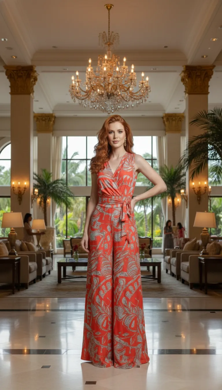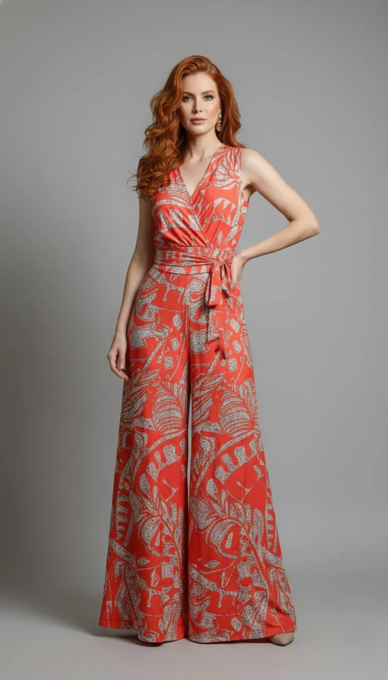 O Macacão Transpassado Regata Riviera é a escolha ideal para quem busca uma peça statement que une o conforto de uma roupa fluida à sofisticação de um visual editorial. A peça única apresenta um decote V profundo e uma modelagem regata, perfeita para climas quentes. O corpo é desenhado em um estilo transpassado (wrap) que se ajusta na cintura com uma faixa de amarração do próprio tecido, valorizando a silhueta de forma versátil. A estampa exclusiva é o ponto focal, com um fundo Vermelho Alaranjado vibrante adornado por padrões detalhados de arabescos ou folhagens em Cinza Claro. A calça possui um corte reto a pantalona e um caimento extremamente fluido e leve, característico de tecidos premium. O material aparenta ser uma malha Fluity ou similar, proporcionando um toque macio e um movimento impecável. Uma peça imponente e chic para diversas ocasiões.