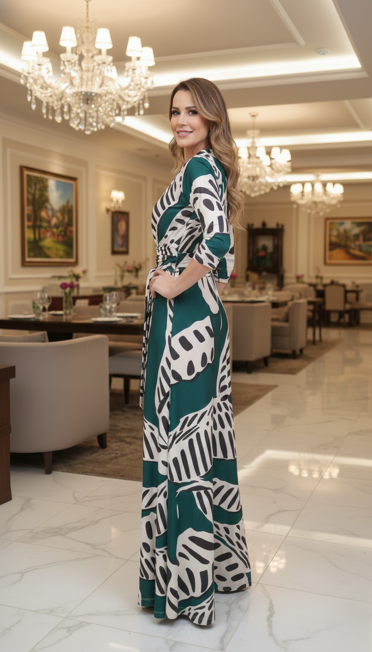 Decote: Decote V Transpassado (Envelope), que é ajustável, valoriza o colo e é extremamente lisonjeiro para diversas silhuetas.
