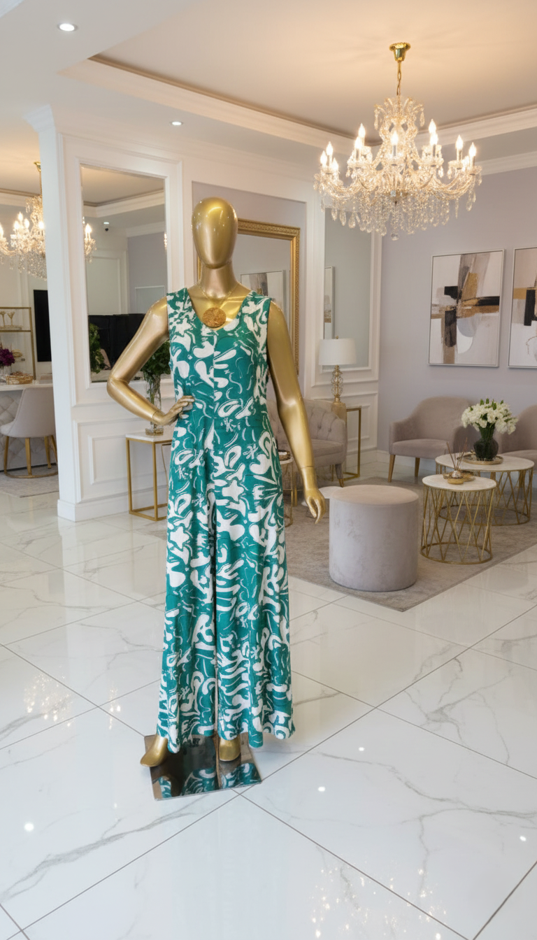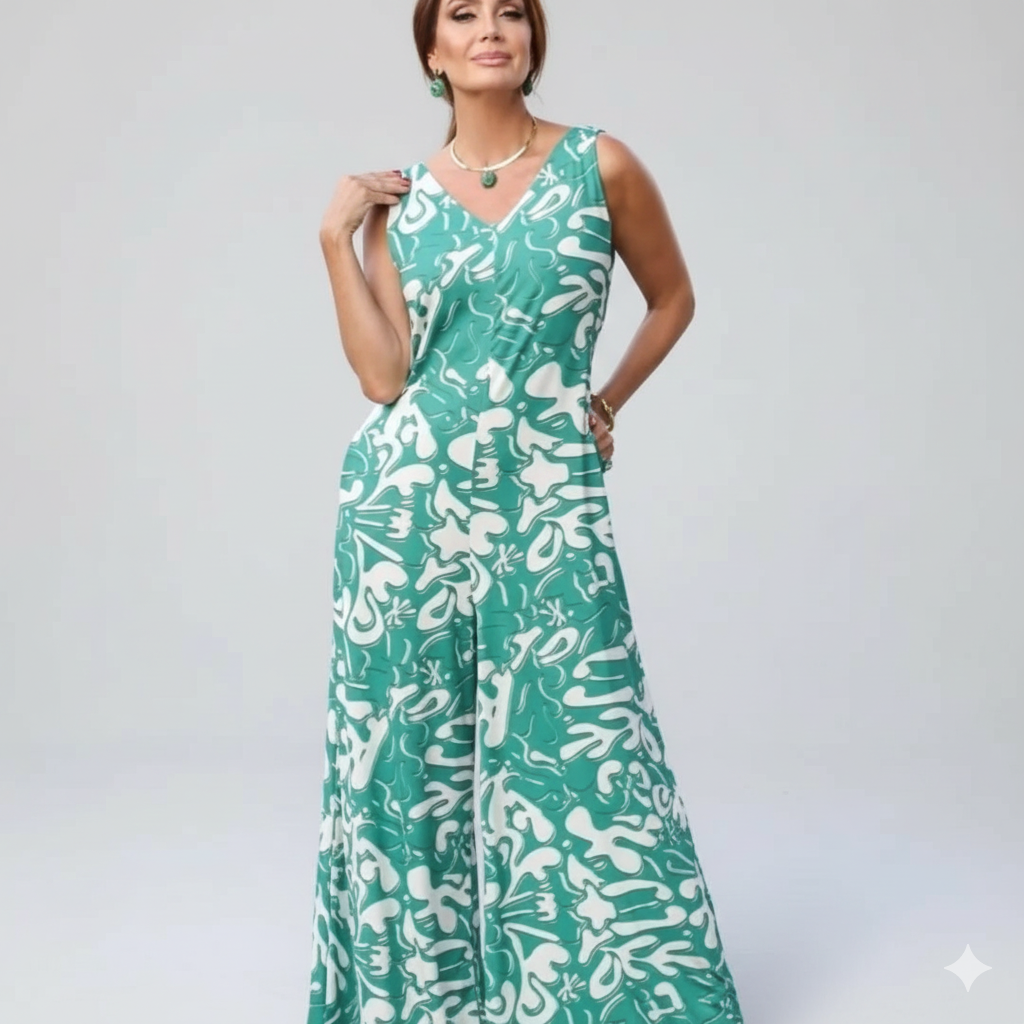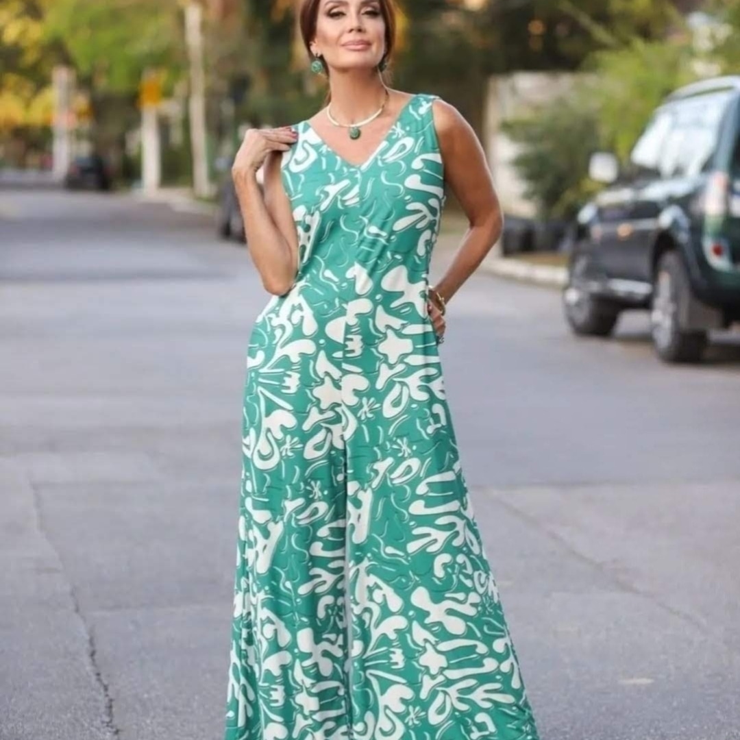 “Nosso Macacão Pantalona em Malha Fluity Premium é a essência do estilo statement. A combinação atemporal do Verde Esmeralda e Branco em uma estampa exclusiva, aliada à modelagem ampla, garante uma silhueta alongada e um caimento perfeito sem abrir mão do conforto. O luxo de se vestir bem sem esforço.“