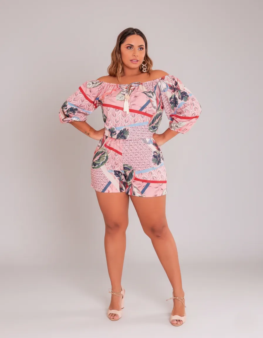 Este macaquinho deslumbrante apresenta uma estampa geométrica e floral vibrante, predominantemente em tons de rosa claro e coral, com detalhes sutis em verde menta, azul e amarelo. A combinação de cores é harmoniosa e eleva o visual, tornando-o perfeito para as estações mais quentes e ambientes descontraídos.